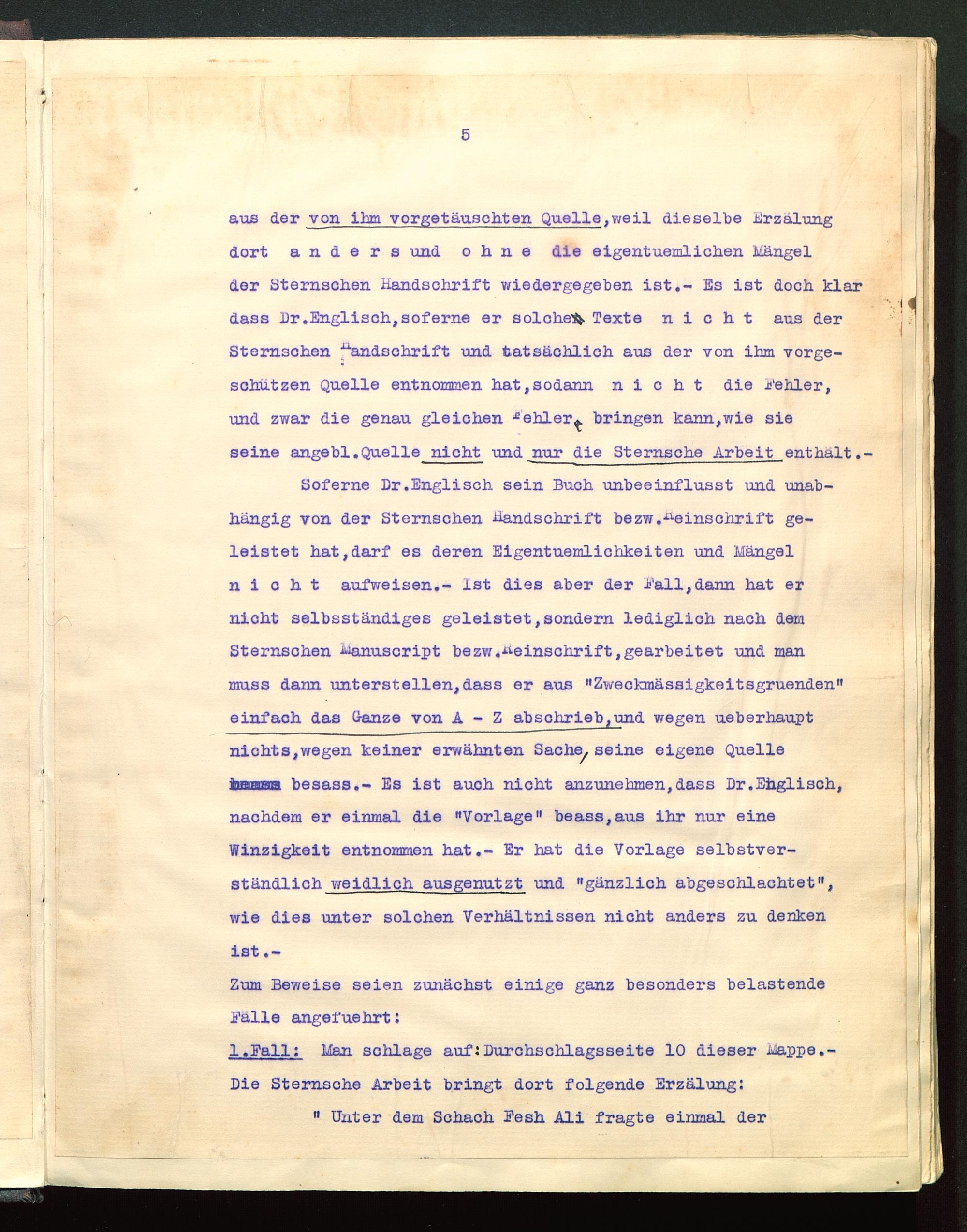 Soferne Dr.Englisch sein Buch unbeeinflusst und unab-hängig von der Sternschen Handschrift bezw.Reinschrift ge-leistet hat,darf es deren Eigentümlichkeiten und Mängelnicht aufweisen.- ist dies aber der i'al^dann hat ernicht selbsständiges geleistet,sondern lediglich nach demSternschen ■u^anuscript bezw.^einschrift,gearbeitet und manmuss dann unterstellen,dass er aus "Zweckmässigkeitsgruenden"einfach das Ganze von A - Z abs chrieb,u nd wegen ueberhauptnichts,wegen keiner erwähnten Sache, seine eigene QuelleioBueäfina besass.- Es ist auch nicht anzunehmen,dass Dr.Englisch,nachdem er einmal die "Vorlage" beass,aus ihr nur eineWinzigkeit entnommen hat.- Er hat die Vorlage selbstver-ständlich jvejldjyxh^^ und "gänzlich abgeschlachtet",wie dies unter solchen Verhältnissen nicht anders zu denkenist .-