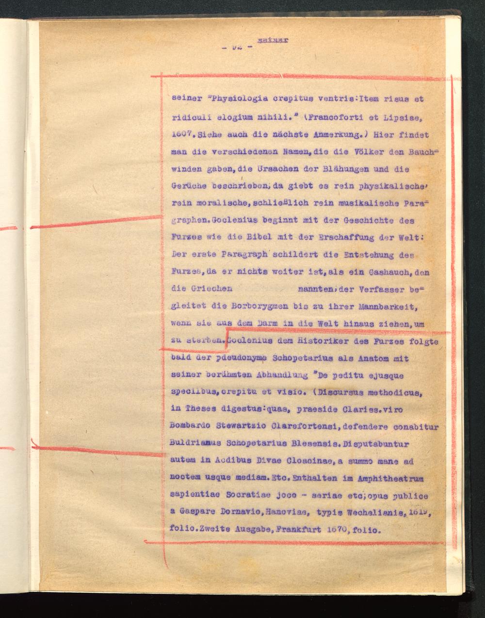 •au auüj/bon.toulöniua dem hi^toriJcer dea Furzes folgteuaia uüx pdeudonyme Sohopetarius als Anatom mitseiner uoräumten Abhandlung "De peditu ejusque3peciiDU3, crepitu et viaio. (DisoursU3 methodicus,in läeses dlgestus^quaa, praeside Clariss.viroBombarao 3tewartzio Oiarsfortensi, dafandere conabiturBuidriaaus Scnopetarius Bleaensis. Di sputabunturautem in Aodibus Divae Oloaoinae, a summo mane adnoctea usque mediana, isto. Sntnalten im Araphitheatrumsapientiao Socratiae joco - seriae etc,opus publicea G-aspare Dornavio,Hano7iae, typis Weoheiiania, lul*,folio.Zweite Ausgabe,Prankfurt 16T0^folio.
