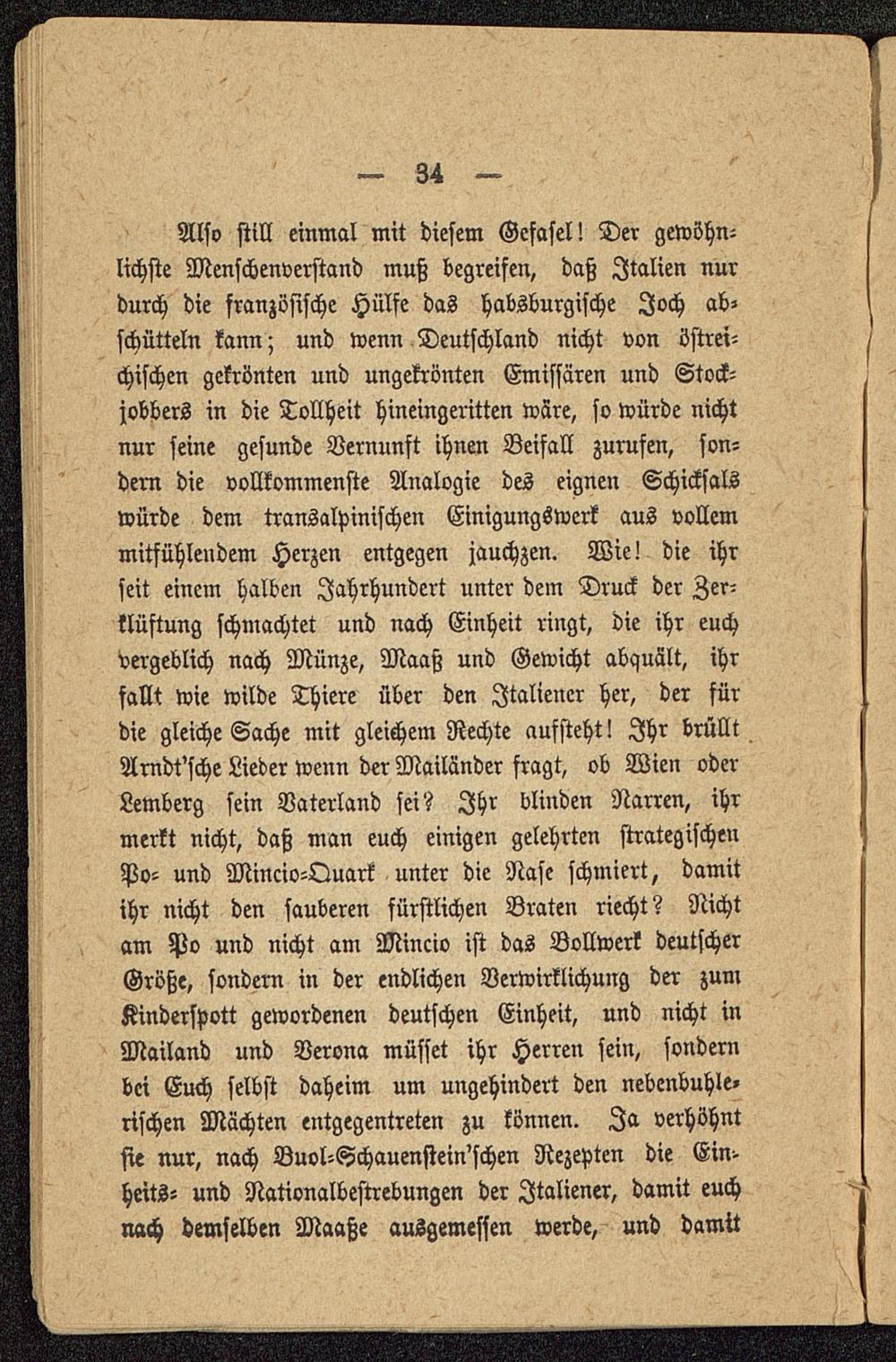 Also still einmal mit diesem Gefasel! Der gewöhn-lichste Menschenverstand muß begreifen, daß Italien nurdurch die französische Hülfe das Habsburgische Joch ab-schütteln kann; und wenn Deutschland nicht von östrei-chischen gekrönten und ungekrönten Emissären und Stock-jobbers in die Tollheit hineingeritten wäre, so würde nichtnur seine gesunde Vernunft ihnen Beifall zurufen, son-dern die vollkommenste Analogie des eignen Schicksalswürde dem transalpinischen Einigungswcrk aus vollemmitfühlendem Herzen entgegen jauchzen. Wie! die ihrseit einem halben Jahrhundert unter dem Druck der Zer-klüftung schmachtet und nach Einheit ringt, die ihr euchvergeblich nach Münze, Maaß und Gewicht abquält, ihrfallt wie wilde Thiere über den Italiener her, der fürdie gleiche Sache mit gleichem Rechte aufsteht! Ihr brülltArndt'sche Lieder wenn der Mailänder fragt, ob Wien oderLemberg sein Vaterland sei? Ihr blinden Narren, ihrmerkt nicht, daß man euch einigen gelehrten strategischenPo- und Mincio-Quark unter die Nase schmiert, damitihr nicht den sauberen fürstlichen Braten riecht? Nichtam Po und nicht am Mincio ist das Bollwerk deutscherGröße, sondern in der endlichen Verwirklichung der zumKinderspott gewordenen deutschen Einheit, und nicht inMailand und Verona müsset ihr Herren sein, sondernbei Euch selbst daheim um ungehindert den nebcnbuhle-rischen Mächten entgegentreten zu können. Ja verhöhntsie nur, nach Buol-Schauenstein 'schen Rezepten die Ein-Heils- und Nationalbestrebungen der Italiener, damit euchnach demselben Maaße ausgemessen werde, und damit