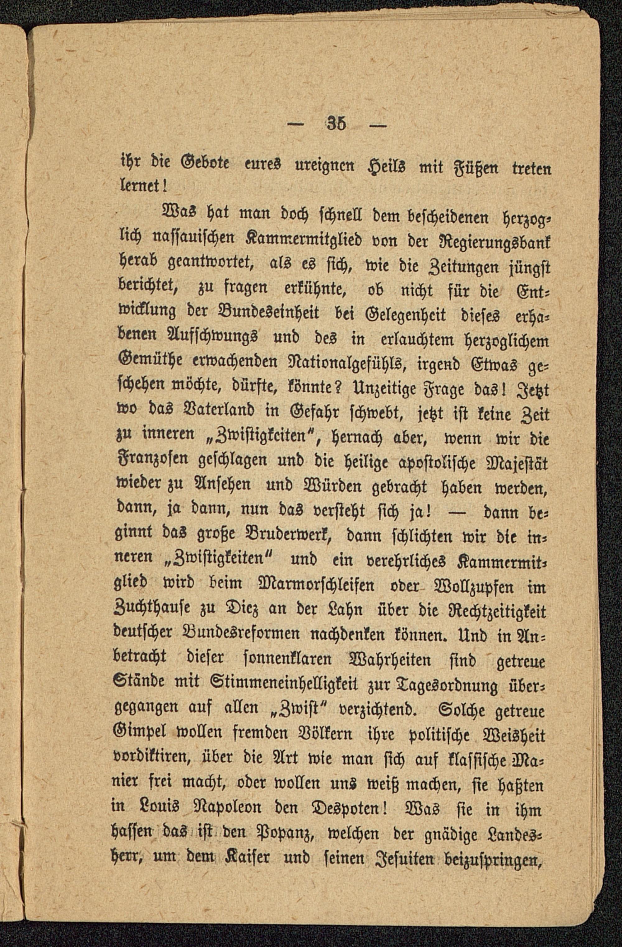Was hat man doch schnell dem bescheidenen herzog-lich nassauischen Kammermitglied von der Regierungsbankherab geantwortet, als es sich, wie die Zeitungen jüngstberichtet, zu fragen erkühnte, ob nicht für die Ent-wicklung der Bundesetnheit bei Gelegenheit dieses erha-benen Aufschwungs und des in erlauchtem herzoglichemGemüthe erwachenden Nationalgefühls, irgend Etwas ge-schehen möchte, dürfte, könnte? Unzeitige Frage das I Jetztwo das Vaterland in Gefahr schwebt, jetzt ist keine Zeitzu inneren „Zwistigkciten", hernach aber, wenn wir dieFranzosen geschlagen und die heilige apostolische Majestätwieder zu Ansehen und Würden gebracht haben werden,dann, ja dann, nun das versteht sich ja! — dann be-ginnt das große Bruderwerk, dann schlichten wir die in-neren „Zwistigkeitcn" und ein verehrliches Kammermit-glied wird beim Marmorschleifen oder Wollzupfen imZuchthause zu Dicz an der Lahn über die Rechtzeitigkeitdeutscher Bundesreformen nachdenken können. Und in An-betracht dieser sonnenklaren Wahrheiten sind getreueStände mit Stimmeneinhelligkeit zur Tagesordnung über-gegangen auf allen „Zwist " verzichtend. Solche getreueGimpel wollen fremden Völkern ihre politische Weisheitvordiktiren, über die Art wie man sich auf klassische Ma-nier frei macht, oder wollen uns weiß machen, sie haßtenin Louis Napoleon den Despoten! Was sie in ihmhassen das ist den Popanz, welchen der gnädige Landes-herr, um dem Kaiser und seinen Jesuiten beizuspriugen.