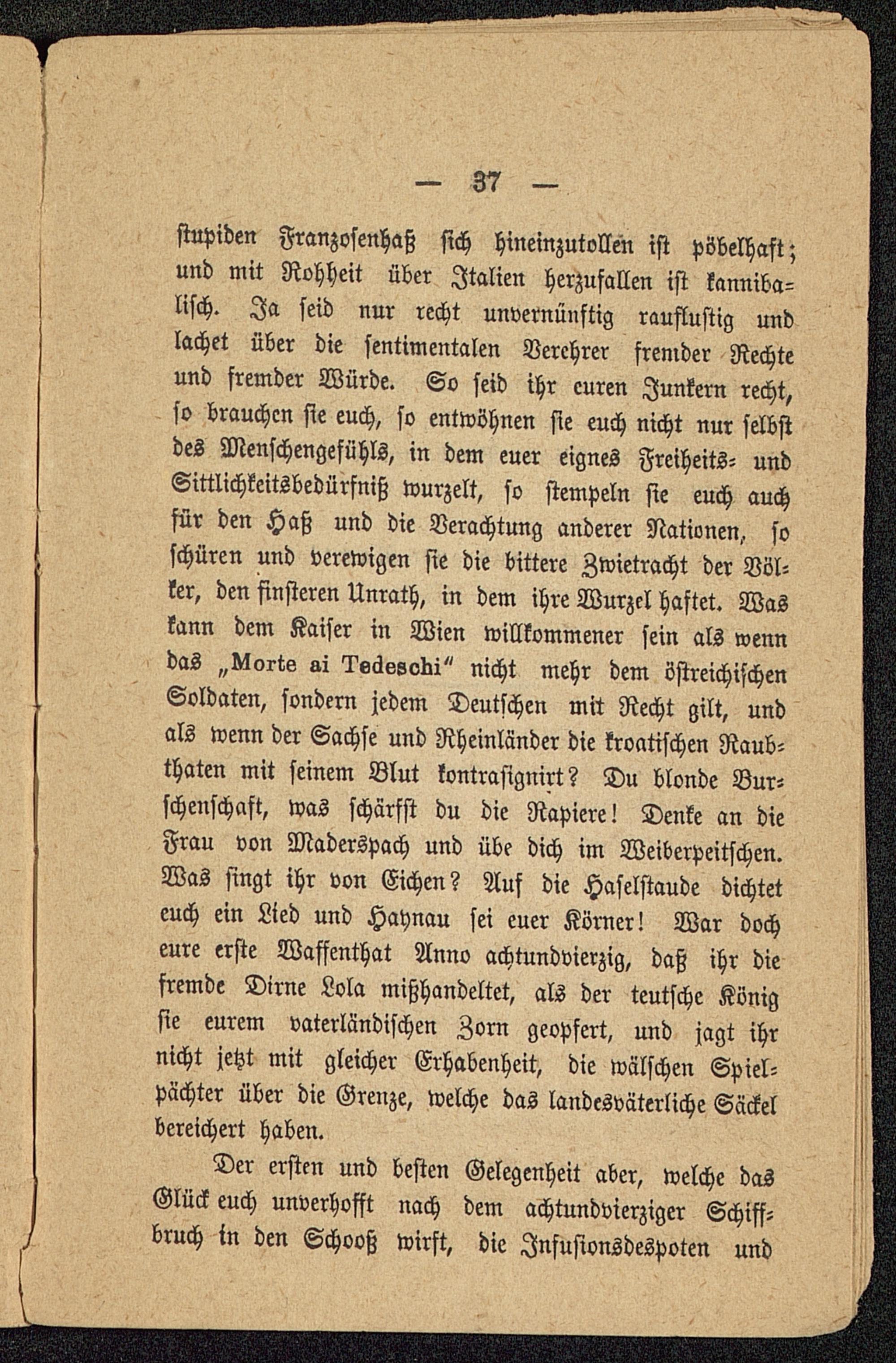 stupiden Franzosenhaß sich hineinzutollen ist pöbelhaft;und mit Rohheit über Italien herzufallen ist kanniba-lisch. Ja seid nur recht unvernünftig rauflustig undlachet über die sentimentalen Verehrer fremder Rechteund fremder Würde. So seid ihr euren Junkern recht,so brauchen sie euch, so entwöhnen sie euch nicht nur selbstdes Menschengefühls, in dem euer eignes Freiheits- undSittlichkeitsbedürfniß wurzelt, so stempeln sie euch auchfür den Haß und die Verachtung anderer Nationen, soschüren und verewigen sie die bittere Zwietracht der Völ-ker, den finsteren Unrath, in dem ihre Wurzel haftet. Waskann dem Kaiser in Wien willkommener sein als wenndas „dlorto »i Isäesoki" nicht mehr dem östreichischenSoldaten, sondern jedem Deutschen mit Recht gilt, undals wenn der Sachse und Rheinländer die kroatischen Raub-thaten mit seinem Blut kontrasignirt? Du blonde Bur-schenschaft , was schärfst du die Rapiere! Denke an dieFrau von Maderspach und übe dich im Weiberpeitschen.Was singt ihr von Eichen? Auf die Haselstaude dichteteuch ein Lied und Haynau sei euer Körner! War docheure erste Waffenthat Anno achtundvierzig, daß ihr diefremde Dirne Lola mißhandeltet, als der teutsche Königsie eurem vaterländischen Zorn geopfert, und jagt ihrnicht jetzt mit gleicher Erhabenheit, die wälschen Spiel-pächter über die Grenze, welche das landesväterliche Säckelbereichert haben.