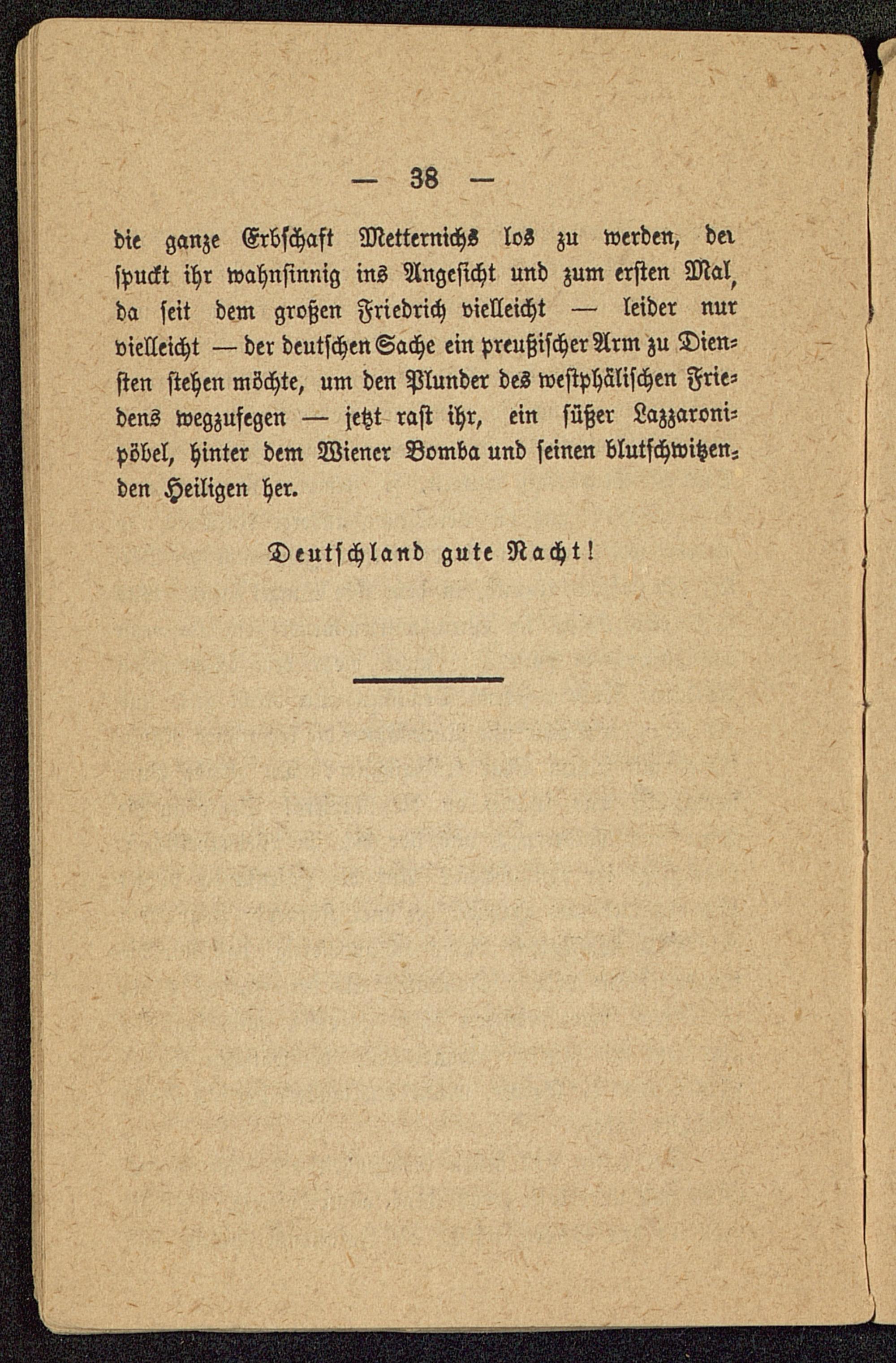 die ganze Erbschaft MetternichS loS zu werden, derspuckt ihr wahnsinnig ins Angesicht und zum ersten Mal,da seit dem großen Friedrich vielleicht — leider nurvielleicht — der deutschen Sache ein preußischer Arm zu Dien-sten stehen möchte, um den Plunder des westphälischen Frie-dens wegzufegen — jetzt rast ihr, ein süßer Lazzaroni-pöbel, hinter dem Wiener Bomba und seinen blutschwihen-den Heiligen her.