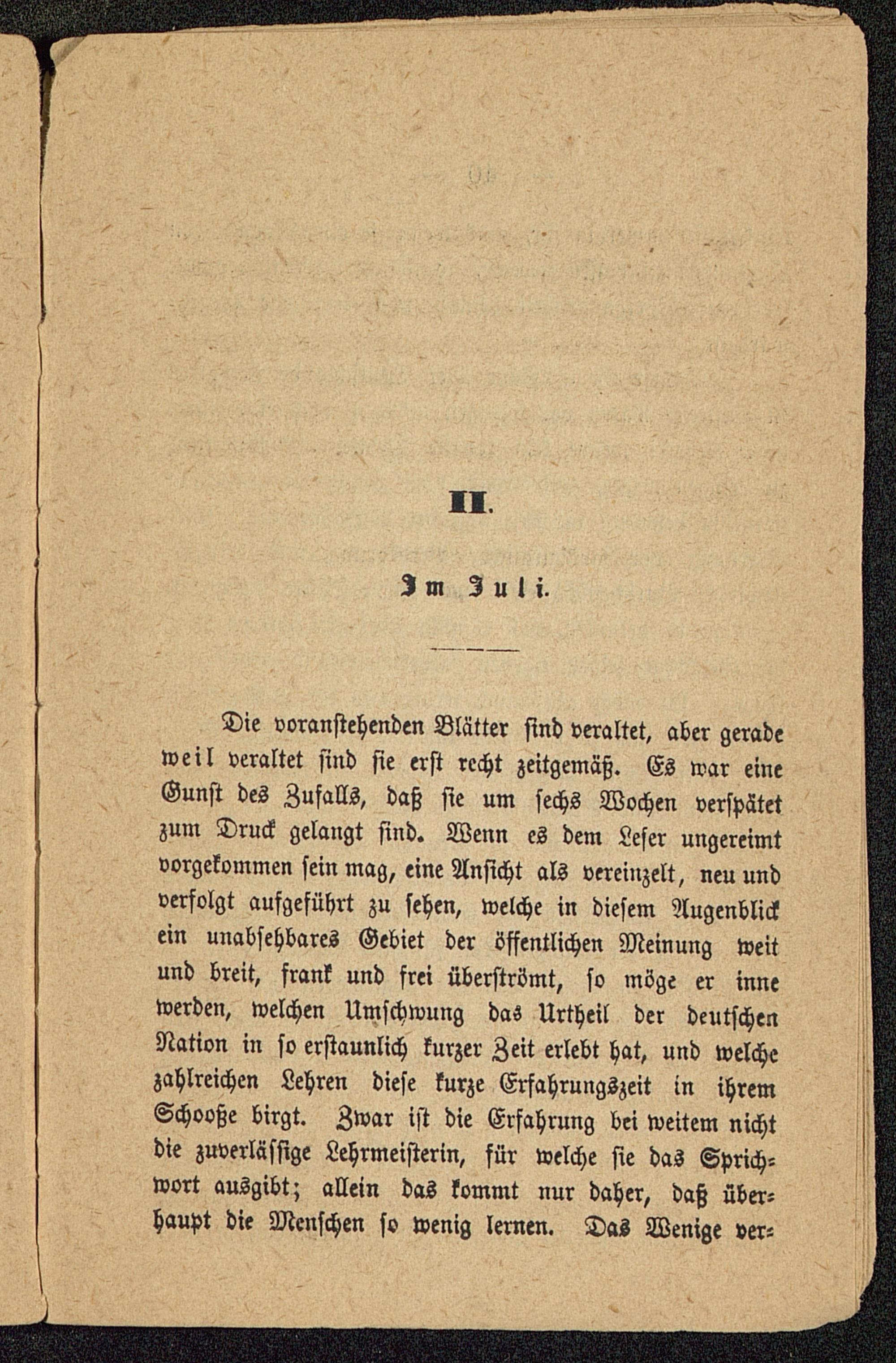 Die voranstehenden Blätter sind veraltet, aber geradeweil veraltet sind sie erst recht zeitgemäß. Es war eineGunst des Zufalls, daß sie um sechs Wochen verspätetzum Druck gelangt sind. Wenn es dem Leser ungereimtvorgekommen sein mag, eine Ansicht als vereinzelt, neu undverfolgt aufgeführt zu sehen, welche in diesem Augenblickein unabsehbares Gebiet der öffentlichen Meinung weitund breit, frank und frei überströmt, so möge er innewerden, welchen Umschwung das Urtheil der deutschenNation in so erstaunlich kurzer Zeit erlebt hat, und welchezahlreichen Lehren diese kurze Erfahrungszeit in ihremSchooße birgt. Zwar ist die Erfahrung bei weitem nichtdie zuverlässige Lehrmeistern, für welche sie das Sprich-wort ausgibt; allein das kommt nur daher, daß über-haupt die Menschen so wenig lernen. Das Wenige »er-