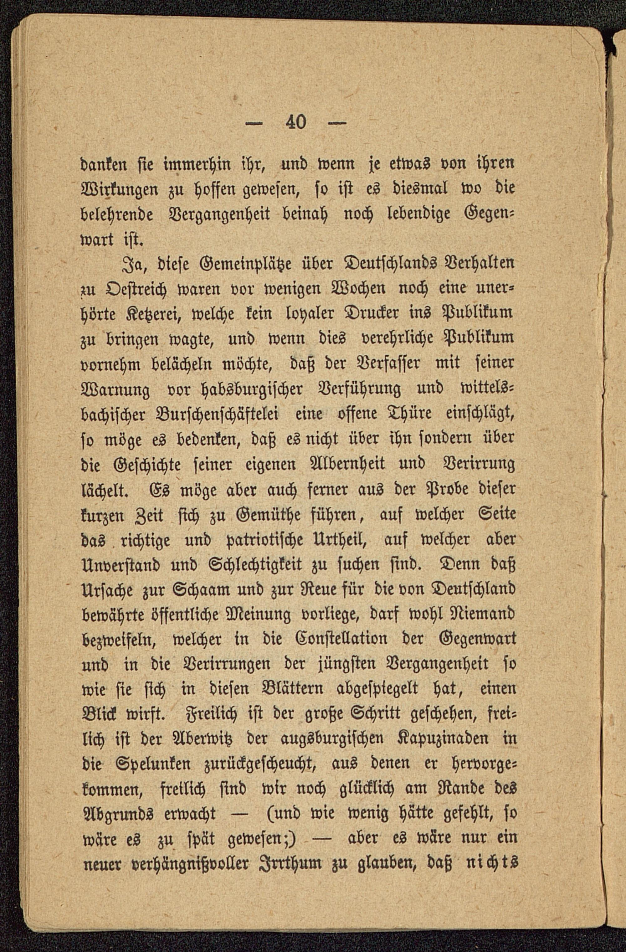 Ja, diese Gemeinplätze über Deutschlands Verhaltenzu Oestreich waren vor wenigen Wochen noch eine uner-hörte Ketzerei, welche kein loyaler Drucker ins Publikumzu bringen wagte, und wenn dies verehrliche Publikumvornehm belächeln möchte, daß der Verfasser mit seinerWarnung vor habsburgischer Verführung und Wittels-bachischer Burschenschäftelei eine offene Thüre einschlägt,so möge es bedenken, daß es nicht über ihn sondern überdie Geschichte seiner eigenen Albernheit und Verirrunglächelt. Es möge aber auch ferner aus der Probe dieserkurzen Zeit sich zu Gemüthe führen, auf welcher Seitedas richtige und patriotische Urtheil, auf welcher aberUnverstand und Schlechtigkeit zu suchen sind. Denn daßUrsache zur Schaam und zur Reue für die von Deutschland bewährte öffentliche Meinung vorliege, darf wohl Niemandbezweifeln, welcher in die Constellation der Gegenwartund in die Verirrungen der jüngsten Vergangenheil sowie sie sich in diesen Blättern abgespiegelt hat, einenBlick wirft. Freilich ist der große Schritt geschehen, frei-lich ist der Aberwitz der augsburgischen Kapuzinaden indie Spelunken zurückgescheucht, aus denen er hervorge-kommen, freilich sind wir noch glücklich am Rande desAbgrunds erwacht — (und wie wenig hätte gefehlt, sowäre es zu spät gewesen;) — aber es wäre nur einneuer verhängnißvoller Irrthum zu glauben, daß nichts