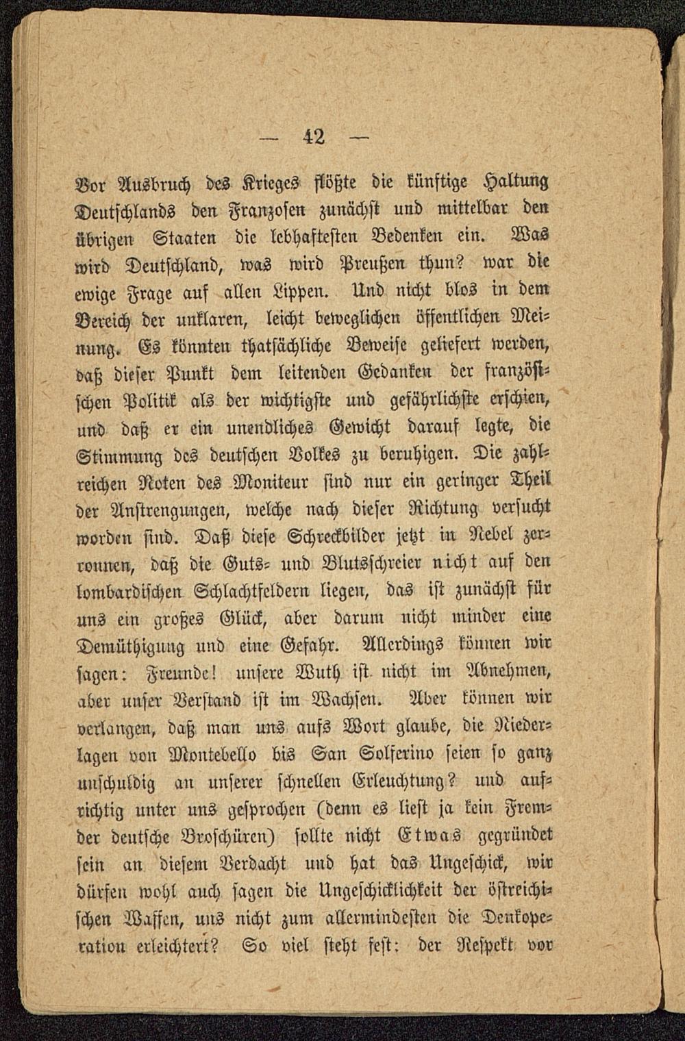 Vor Ausbruch des Krieges flößte die künftige HaltungDeutschlands den Franzosen zunächst und mittelbar denübrigen Staaten die lebhaftesten Bedenken ein. Waswird Deutschland, was wird Preußen thun? war dieewige Frage auf allen Lippen. Und nicht blos in demBereich der unklaren, leicht beweglichen öffentlichen Mei-nung. Es könnten thatsächliche Beweise geliefert werden,daß dieser Punkt dem leitenden Gedanken der französi-schen Politik als der wichtigste und gefährlichste erschien,und daß er ein unendliches Gewicht darauf legte, dieStimmung des deutschen Volkes zu beruhigen. Die zahl-reichen Noten des Moniteur sind nur ein geringer Theilder Anstrengungen, welche nach dieser Richtung versuchtworden sind. Daß diese Schreckbilder jetzt in Nebel zer-ronnen, daß die Guts- und Blutsschrcier nicht auf denlombardischen Schlachtfeldern liegen, das ist zunächst füruns ein großes Glück, aber darum nicht minder eineDemüthigung und eine Gefahr. Allerdings können wirsagen: Freunde! unsere Wuth ist nicht im Abnehmen,aber unser Verstand ist im Wachsen. Aber können wirverlangen, daß man uns aufs Wort glaube, die Nieder-lagen von Montebello bis Sän Solfcrino seien so ganzunschuldig an unserer schnellen Erleuchtung? und auf-richtig unter uns gesprochen (denn es liest ja kein Frem-der deutsche Broschüren) sollte nicht Etwas gegründetsein an diesem Verdacht und hat das Ungeschick, wirdürfen wohl auch sagen die Ungeschicklichkeit der östreichi-schen Waffen, uns nicht zum allermindesten die Dcnkope-ration erleichtert? So viel steht fest: der Respekt vor