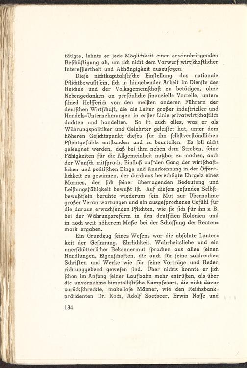 Ein Grundzug feines Wefens war die abfolute Lauter=keit der Gefinnung. Ehrlichkeit, Wahrheitsliebe und einunerfchütterlicher Bekennermut fprachen aus allen feinenHandlungen, Eigenfdiaften, die auch für feine zahlreichenSchriften und Werke wie für feine Vorträge und Redenrichtunggebend gewefen find. Über nichts konnte er fichfchon im Anfang feiner Laufbahn mehr entrüften, als überdie unvornehme bimetalliflifdie Kampfesart, die nicht davorzurückfehreckte, makellofe Männer, wie den Reichsbank=präfidenten Dr. Koch, Adolf Soetbeer, Erwin Naffe und