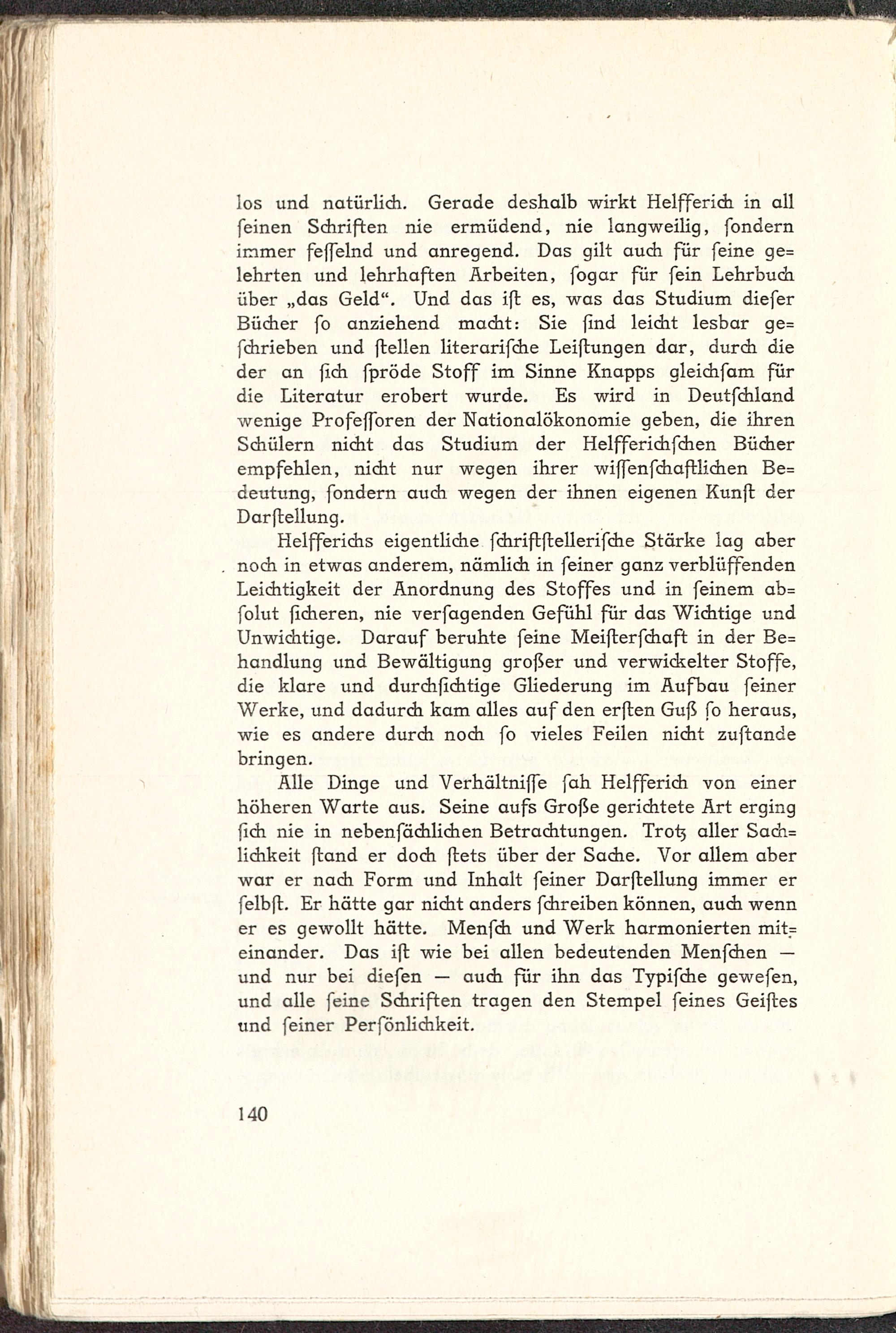 Alle Dinge und Verhältniffe fah Helfferich von einerhöheren Warte aus. Seine aufs Große gerichtete Art erging(ich nie in nebenfächlichen Betrachtungen. Trotj aller Sach=lichkeit ftand er doch ftets über der Sache. Vor allem aberwar er nach Form und Inhalt feiner Darftellung immer erfelbft. Er hätte gar nicht anders fchreiben können, auch wenner es gewollt hätte. Menfch und Werk harmonierten mit=einander. Das ift wie bei allen bedeutenden Menfchen —und nur bei diefen — auch für ihn das Typifche gewefen,und alle feine Schriften tragen den Stempel feines Geiftesund feiner Perfönlichkeit.