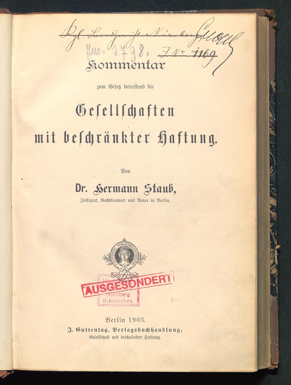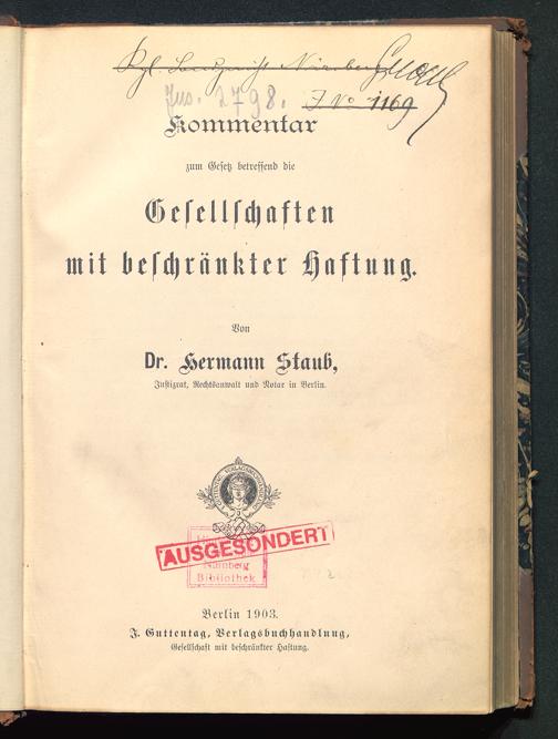 zum Gesetz betreffend diemit beschrankter Haftung.VonDr. Kermcmn Staut»,Jnstizrat, Rcchtsanwalt und Notar in Berlin ,ZINdNKBerlin 1908.I. Guttentag, Ve r l ags b u ch h andl u n cs,Gesellschaft mit beschränkter Haftung.