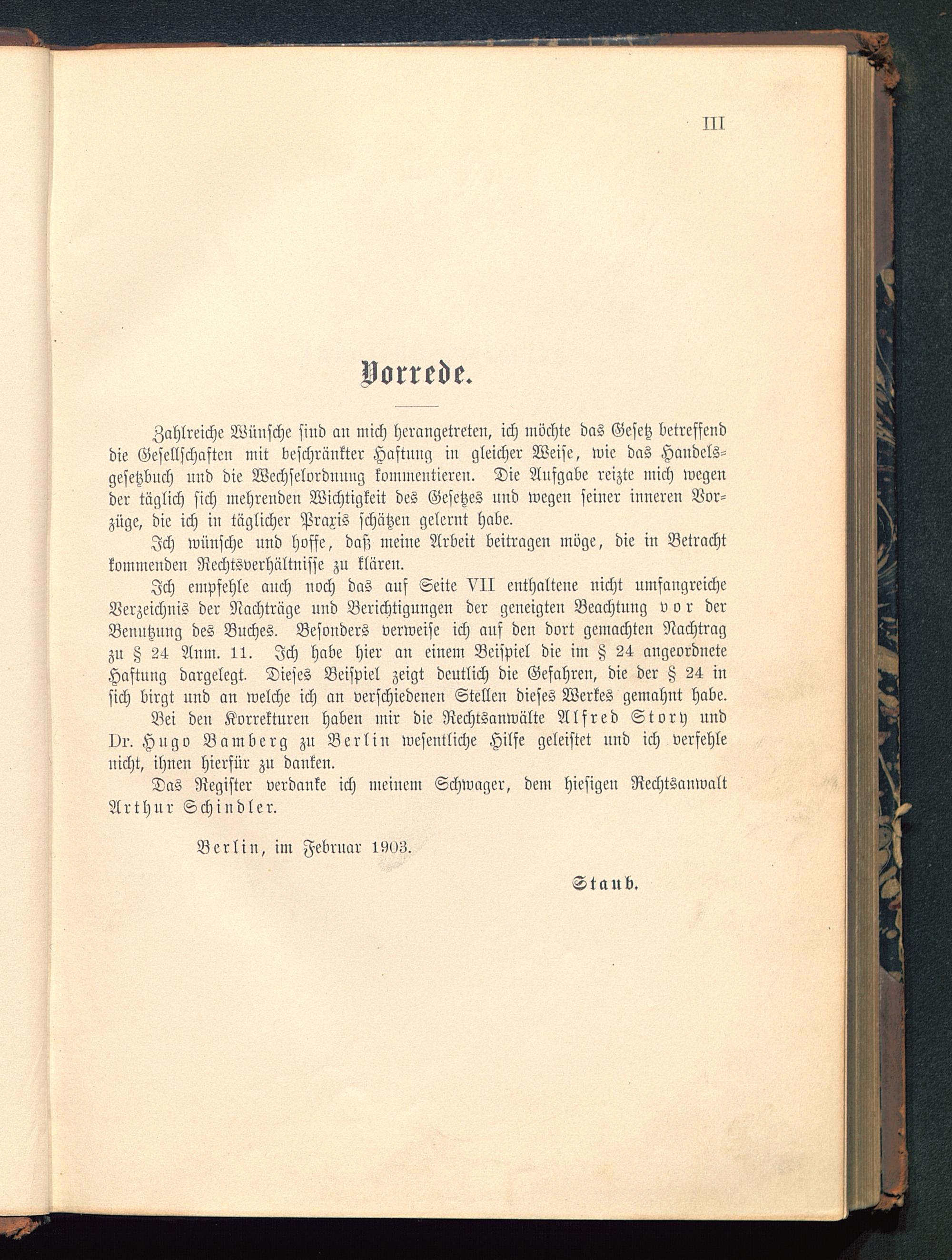 Zahlreiche Wünsche sind an mich herangetreten, ich möchte das Gesetz betreffenddie Gesellschaften mit beschränkter Haftung in gleicher Weise, wie das Handels-gesetzbuch und die Wechselordnung kommentieren. Die Aufgabe reizte mich wegender täglich sich mehrenden Wichtigkeit des Gesetzes und wegen seiner inneren Vor-züge, die ich in täglicher Praxis schätzen gelernt habe.