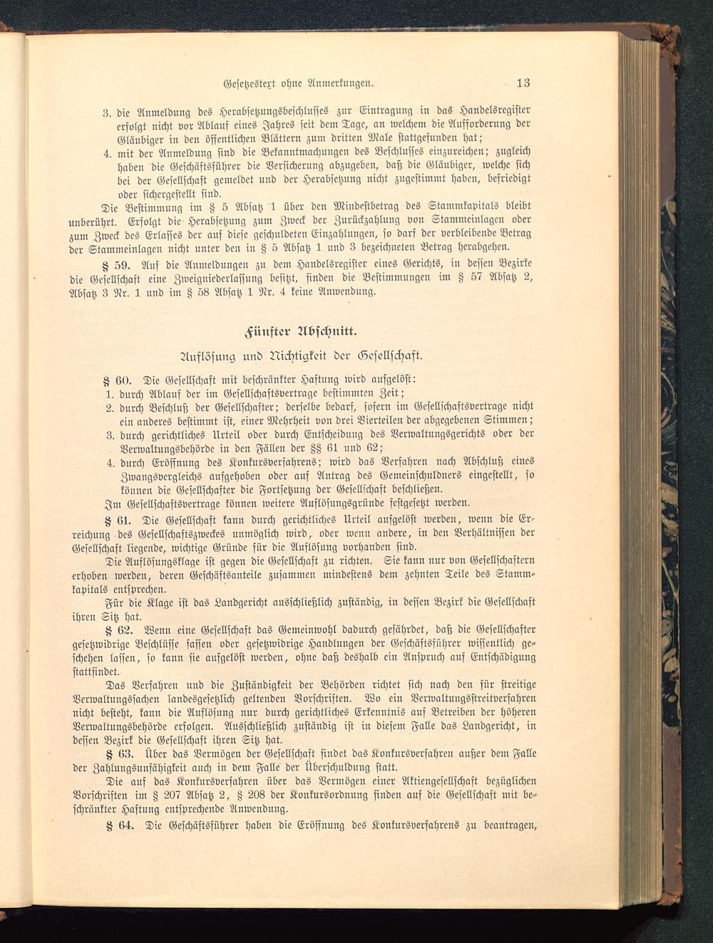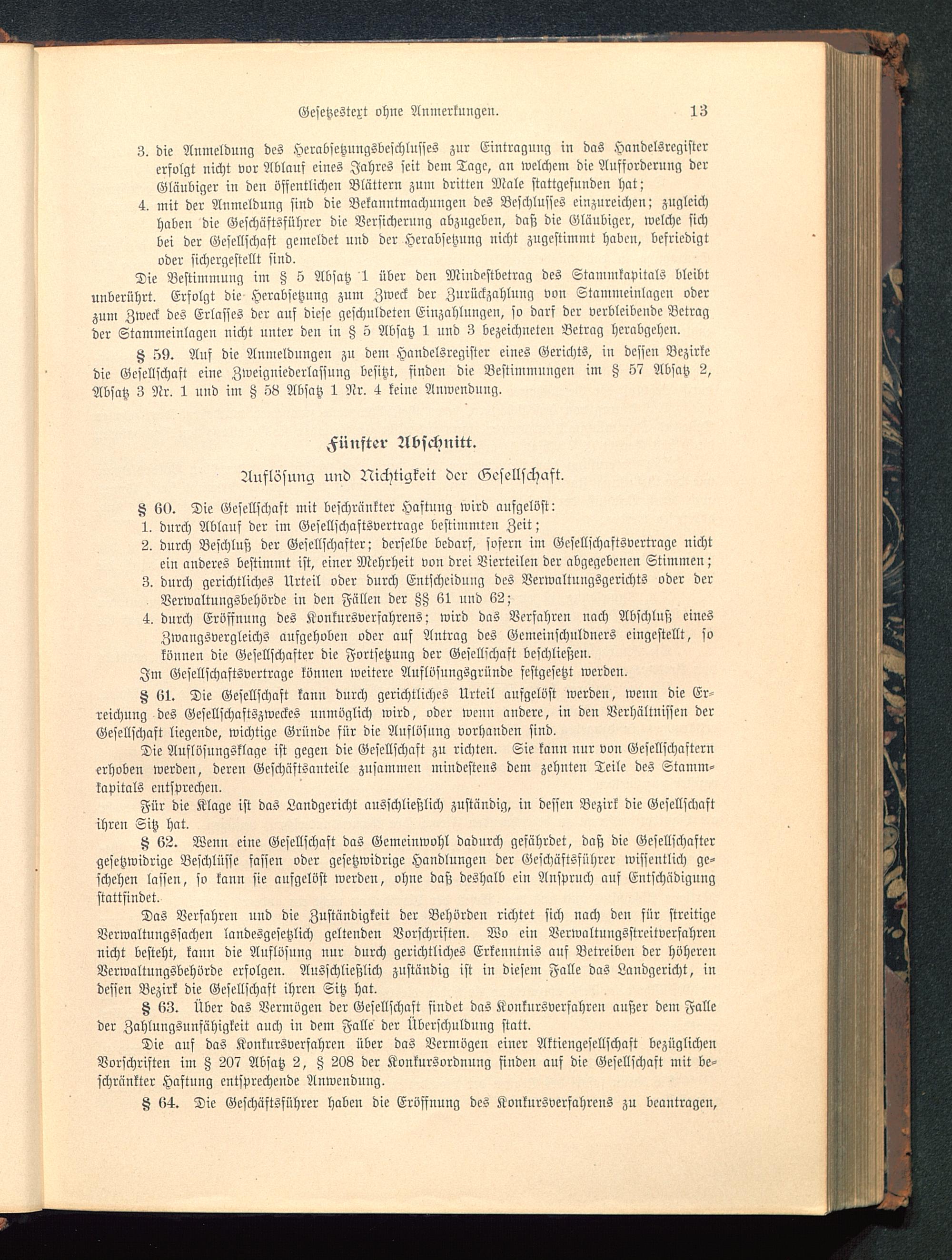 tz 62. Wenn eine Gesellschaft das Gemeinwohl dadurch gefährdet, daß die Gesellschaftergesetzwidrige Beschlüsse fassen oder gesetzwidrige Handlungen der Geschäftsführer wissentlich ge-schehen lassen, so kann sie aufgelöst werden, ohne daß deshalb ein Anspruch auf Entschädigungstattfindet.