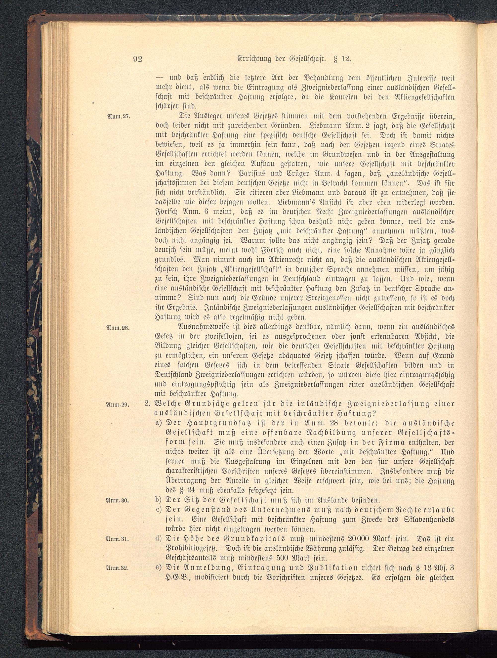 Anm .ss. 2. Welche Grundsätze gelten für die inländische Zweigniederlassung einerausländischen Gesellschaft mit beschränkter Haftung?«,) Der Hauptgrundsatz ist der in Anm. 28 betonte: die ausländischeGesellschaft muß eine offenbare Nachbildung unserer Gesellschafts-form sein. Sie muß insbesondere auch einen Zusatz in der Firma enthalten, dernichts weiter ist als eine Übersetzung der Worte „mit beschränkter Haftung." Undferner muß die Ausgestaltung im Einzelnen mit den den für unsere Gesellschaftcharakteristischen Vorschriften unseres Gesetzes übereinstimmen. Insbesondere muß dieÜbertragung der Anteile in gleicher Weise erschwert sein, wie bei uns; die Haftungdes Z 24 muß ebenfalls festgesetzt sein,b) Der Sitz der Gesellschaft muß sich im Auslande befinden,o) Der Gegenstand des Unternehmens muß nach deutschem Rechte erlaubtsein. Eine Gesellschaft mit beschränkter Haftung zum Zwecke des Sklavenhandelswürde hier nicht eingetragen werden können,cl) Die Höhe des Grundkapitals muß mindestens 29999 Mark sein. Das ist einPröhibitivgesetz. Doch ist die ausländische Währung zulässig. Der Betrag des einzelnenGeschäftsanteils muß mindestens ö99 Mark sei»,s) Die Anmeldung, Eintragung und Publikation richtet sich nach Z 13 Abs. 3H.G.B., modificiert durch die Vorschriften unseres Gesetzes. Es erfolgen die gleichen