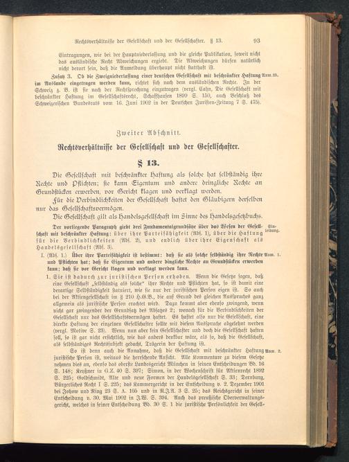 So ist denn auch die Annahme, daß die Gesellschaft mit beschränkter Haftung Anm. 2.juristische Person ist, weitaus die herrschende Ansicht. Alle Kommentare zu diesem Gesetzenehmen dies an, ebenso das oberste Landesgericht München in seinen Entscheidungen Bd. 16S. 148; Keyßner in tZ.A. 40 S. 397; Simon, in der Wochenschrift für Aktienrecht 1892S. 225; Goldschmidt, Alte und neue Formen der Handelsgesellschaft S. 33; Dernburg ,Bürgerliches Recht I S. 225; das Kammergericht in der Entscheidung v. 2. Dezember 1901bei Johow und Ring 23 S. 105 und in R.J.A. 3 S. 25; das Reichsgericht in seinerEntscheidung v. 30. Mai 1902 in J.W. S. 394. Auch das preußische Oberverwaltungs-gericht, welches in seiner Entscheidung Bd. 30 S. 1 die juristische Persönlichkeit der Gesell-