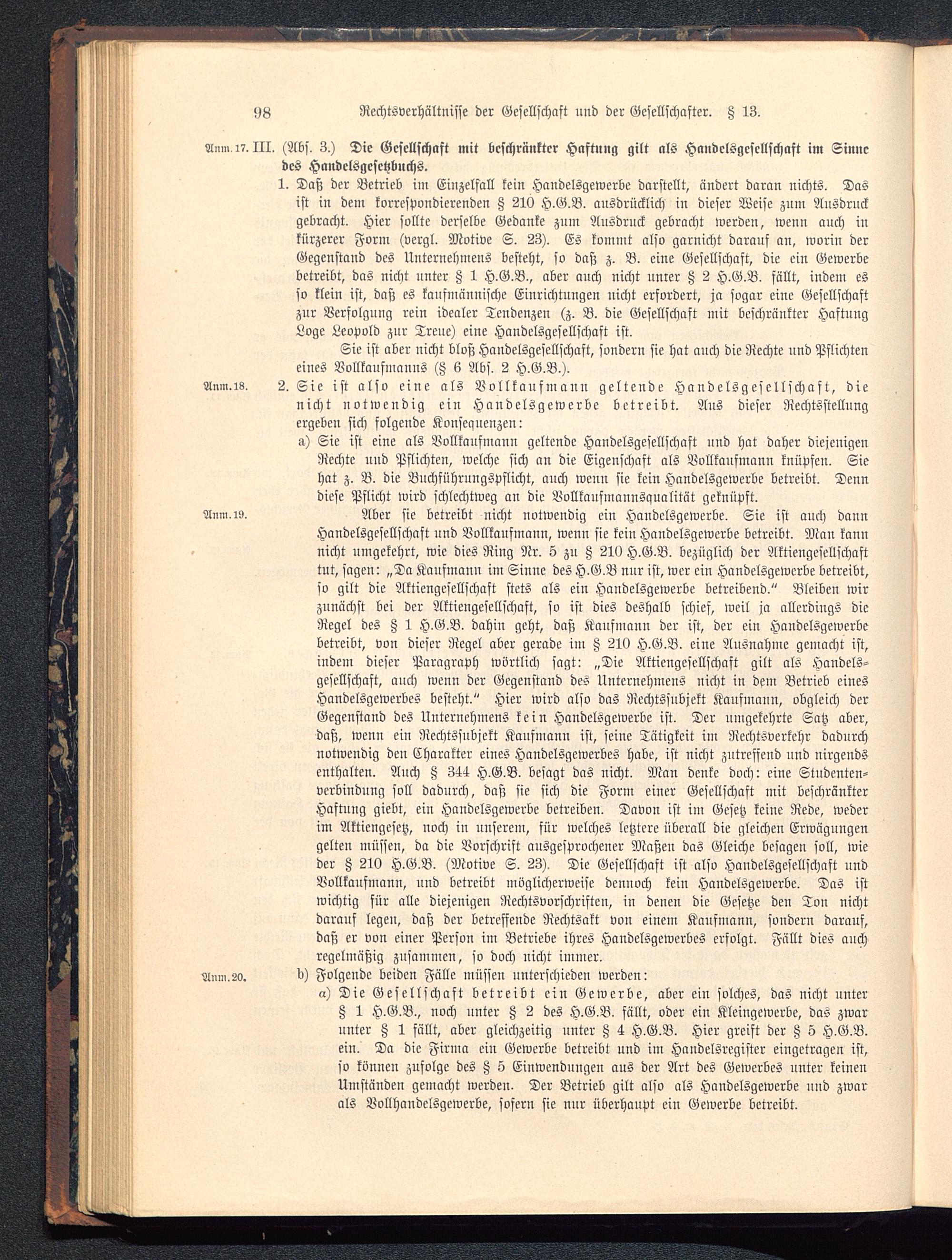 Handelsgesellschaft und Vollkaufmanu, wenn sie kein Handelsgewerbe betreibt. Man kannnicht umgekehrt, wie dies Ring Nr. 5 zu K 210 H.G.B, bezüglich der Aktiengesellschafttut, sagen: „Da Kaufmann im Sinne des H.G.B nur ist, wer ein Handelsgewcrbe betreibt,so gilt die Aktiengesellschaft stets als ein Handelsgewerbe betreibend." Bleiben wirzunächst bei der Aktiengesellschaft, so ist dies deshalb schief, weil ja allerdings dieRegel des § 1 H.G.B, dahin geht, daß Kaufmann der ist, der ein Handelsgewerbebetreibt, von dieser Regel aber gerade im § 210 H.G.B, eine Ausnahme gemacht ist,indem dieser Paragraph wörtlich sagt: „Die Aktiengesellschaft gilt als Handels-gesellschaft, auch wenn der Gegenstand des Unternehmens nicht in dem Betrieb einesHandelsgewerbes besteht." Hier wird also das Rechtssubjekt Kaufmann, obgleich derGegenstand des Unternehmens kein Handelsgewerbe ist. Der umgekehrte Satz aber,daß, wenn ein Rechtssubjekt Kaufmann ist, seine Tätigkeit im Rechtsverkehr dadurchnotwendig den Charakter eines Handelsgewerbes habe, ist nicht zutreffend und nirgendsenthalten. Auch Z 344 H.G.B, besagt das nicht. Man denke doch: eine Studenten-verbindung soll dadurch, daß sie sich die Form einer Gesellschaft mit beschränkterHaftung giebt, ein Handelsgewerbe betreiben. Davon ist im Gesetz keine Rede, wederim Aktiengesetz, noch in unserem, für welches letztere überall die gleichen Erwägungengelten müssen, da die Vorschrift ausgesprochener Maßen das Gleiche besagen soll, wieder Z 210 H.G.B. (Motive S. 23). Die Gesellschaft ist also Handelsgesellschaft undVollkaufmann, und betreibt möglicherweise dennoch kein Handelsgewerbe. Das istwichtig für alle diejenigen Rechtsvorschriften, in denen die Gesetze den Ton nichtdarauf legen, daß der betreffende Rechtsakt von einem Kaufmann, sondern darauf,daß er von einer Person im Betriebe ihres Handelsgewerbes erfolgt. Fällt dies auchregelmäßig zusammen, so doch nicht immer.