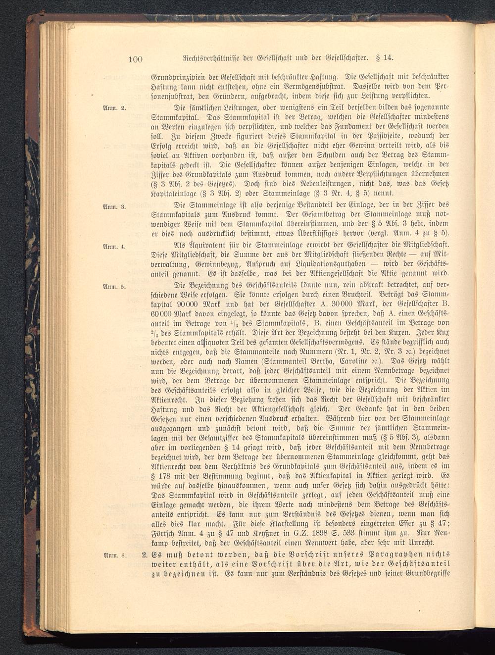 schiedene Weise erfolgen. Sie könnte erfolgen durch einen Bruchteil. Beträgt das Stamm-kapital gvvM Mark und hat der Gesellschafter 39999 Mark, der Gesellschafter L.69999 Mark davon eingelegt, so könnte das Gesetz davon sprechen, daß .4. einen Geschäfts-anteil im Betrage von ftg des Stammkapitals, L. einen Geschäftsanteil im Betrage von2/g des Stammkapitals erhält. Diese Art der Bezeichnung besteht bei den Kuxen. Jeder Kuxbedeutet einen aliquoten Teil des gesamten Gesellschaftsvermögens. Es stände begrifflich auchnichts entgegen, daß die Stammanteile nach Nummern (Nr. 1, Nr. 2, Nr. 3 ec.) bezeichnetwerden, oder auch nach Namen (Stammanteil Bertha, Caroline :c.). Das Gesetz wähltnun die Bezeichnung derart, daß jeder Geschäftsanteil mit einem Nennbetrage bezeichnetwird, der dem Betrage der übernommenen Stammeinlage entspricht. Die Bezeichnungdes Geschäftsanteils erfolgt also in gleicher Weise, wie die Bezeichnung der Aktien imAktienrecht. In dieser Beziehung stehen sich das Recht der Gesellschaft mit beschränkterHaftung und das Recht der Aktiengesellschaft gleich. Der Gedanke hat in den beidenGesetzen nur einen verschiedenen Ausdruck erhalten. Während hier von der Stammeinlageausgegangen und zunächst betont wird, daß die Summe der sämtlichen Stammein-lagen mit der Gesamtziffer des Stammkapitals übereinstimmen muß (ß 5 Abs. 3), alsdannaber im vorliegenden Z 14 gesagt wird, daß jeder Geschäftsanteil mit dem Nennbetragebezeichnet wird, der dem Betrage der übernommenen Stammeinlage gleichkommt, geht dasAktienrecht von dem Verhältnis des Grundkapitals zum Geschäftsanteil aus, indem es imH 178 mit der Bestimmung beginnt, daß das Aktienkapital in Aktien zerlegt wird. Eswürde auf dasselbe hinauskommen, wenn auch unser Gesetz sich dahin ausgedrückt hätte:Das Stammkapital wird in Geschäftsanteile zerlegt, auf jeden Geschäftsanteil muß eineEinlage gemacht werden, die ihrem Werte nach mindestens dem Betrage des Geschäfts-anteils entspricht. Es kann nur zum Verständnis des Gesetzes dienen, wenn man sichalles dies klar macht. Für diese Klarstellung ist besonders eingetreten Esser zu Z 47;Förtsch Anm. 4 zu Z 47 und Keyßner in 6.6. 1898 S. 533 stimmt ihm zu. Nur Nen-kamp bestreitet, daß der Geschäftsanteil einen Nennwert habe, aber sehr mit Unrecht.