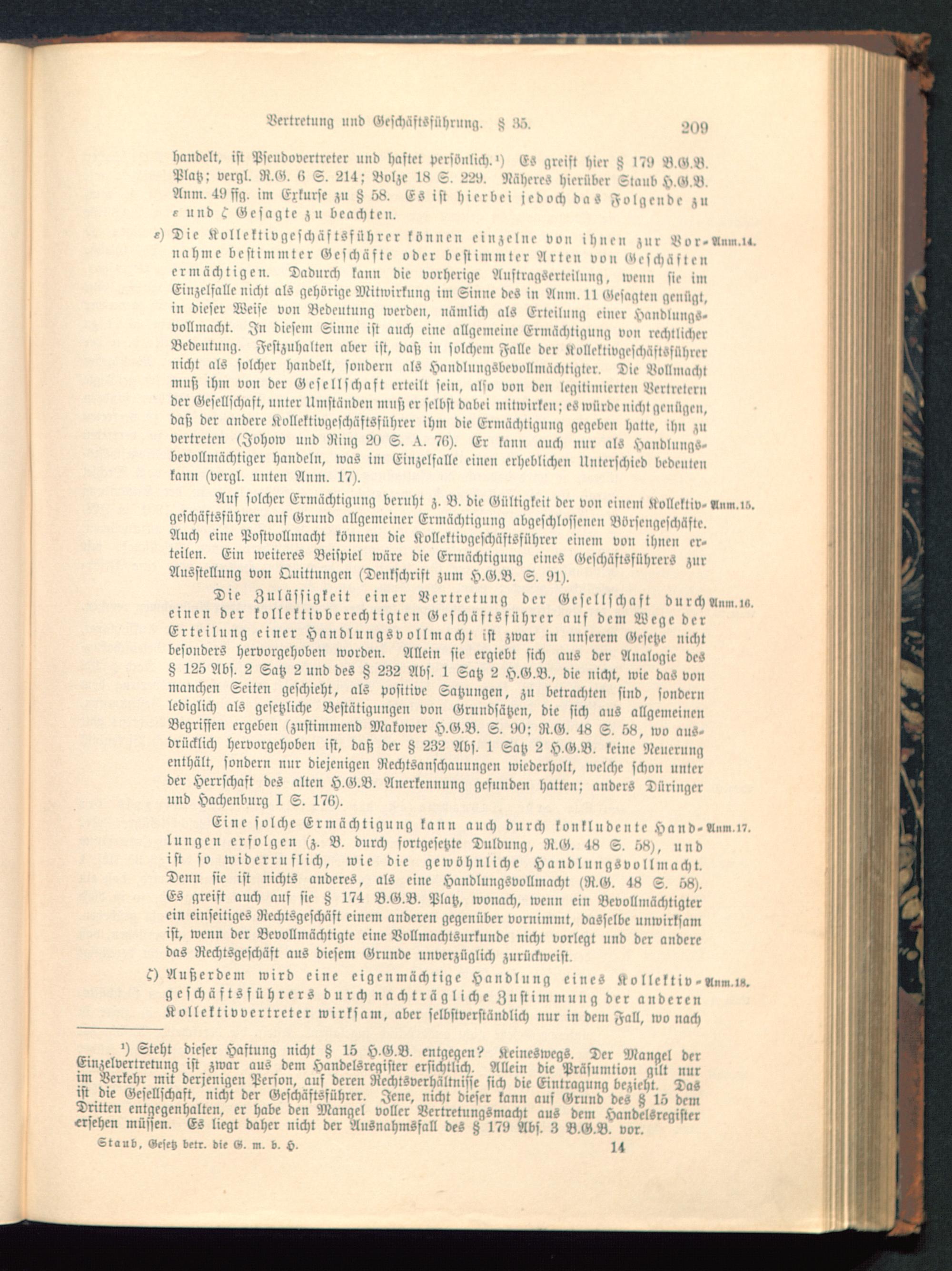 Die Zulässigkcit einer Vertretung der Gesellschaft d u r ch «m». w.einen der kollektivberechtigten Geschäftsführer auf dem Wege derErteilung einer Handlungsvollmacht ist zwar in unserem Gesetze nichtbesonders hervorgehoben worden. Allein sie ergiebt sich aus der Analogie des8 125 Abs. 2 Satz 2 und des 8 232 Abs. 1 Satz 2 H.G.B., die nicht, wie das vonmanchen Seiten geschieht, als positive Satzungen, zu betrachten sind, sonder»lediglich als gesetzliche Bestätigungen von Grundsätzen, die sich aus allgemeinenBegriffen ergeben (zustimmend Makower H.G.B. S. !X): R.G. 48 S. 58, wo aus-drücklich hervorgehoben ist, daß der H 232 Abs. 1 Satz 2 H.G.B, keine Neuerungenthält, sondern nur diejenigen Rechtsanschauungcn wiederholt, welche schon unlerder Herrschaft des alten H.G.B. Anerkennung gefunden hatten; anders Düringcrund Hachenburg I S. 176).