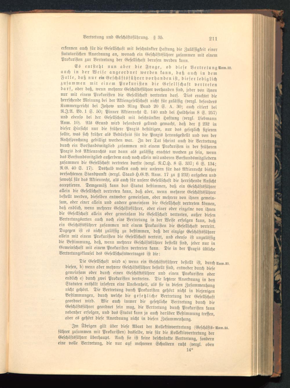 Es entsteht nun aber die Frage, ob diese Vertretung«»»,,«,auch in der Weise angeordnet werden kann, dasi auch in demFalle, daß nur ei» Geschäftsführer vorhanden ist, dieser lediglichzusammen mit einem Prokuristen die Gesellschaft vertretendarf, oder das;, wenn mehrere Geschäftsführer vorhanden sind, jeder von ihnennur mit einem Prokuristen die Gesellschaft vertreten darf. Dies erachtet dieherrschende Meinung bei der Aktiengesellschaft nicht für zulässig (vergl, besonder»jtammergcricht bei Johow und Ring Band 2(1 S. .V AI; auch citiert beiRIA. Bd. 1 S. öd; Pinuer Aktienrecht S. l4<> und bei Holdheil» k S, 2ü7)und ebenso bei der Gesellschaft mit beschränkter Hastung (vergl, LiebmannAm». 10). Als Grund wird besonders geltend gemacht, das; der jj 232 indieser Hinsicht nur die frühere Praxis bestätigen, nur das gesetzlich fixiere»sollte, was sich früher als Bedürfnis für die Praxis herausgestellt und von derRechtsprechung gebilligt worden war. In der Tat scheint auch die Vertretungdurch ein Vorstandsmitglied zusammen mit einem Prokuristen in der früherenPraxis des Aktienrechts nur dann als zulässig erachtet worden zu sein, wenndas Vorstandsmitglied außerdem auch noch allein mit anderen Vorstandsmitgliedernzusammen die Gesellschaft vertreten durste (vergl. R.O.H. 8 S. 337; (> S. 134;R.G. 40 S. 17). Deshalb wollen auch wir unseren für das Aktienrecht bisherversochtenen Standpunkt (vergl. Staub H.G.B. Anm. 17 zu ß 232) ausgeben undsowohl für das Aktienrecht, als auch sür unsere Gesellschaft die herrschende Ansichtacceptieren. Demgemäs; kann das Statut bestimme», das; ein Geschäftsführerallein die Gesellschaft vertreten kann, das; aber, wenn mehrere Geschäftsführerbestellt werden, dieselben entweder gemeinsam, oder mehrere von ihnen gemein-sam, oder einer allein und andere gemeinsam die Gesellschaft vertreten können,das; endlich, wen» mehrere Geschäftsführer, oder einer oder einzelne von ihnendie Gesellschaft allein oder gemeinsam die Gesellschaft vertrete», außer diesenVcrtretungsarte» auch noch eine Vertretung in der Weise erfolgen kann, daßein Geschäftsführer zusammen mit einem Prokuristen die Gesellschaft vertritt.Dagegen ist es nicht zulässig zu bestimmen, das; der einzige Geschäftsführerallein mit einem Prokuristen die Gesellschaft vertritt, und ebenso ist unzulässigdie Bestimmung, daß, wen» mehrere Geschäftsführer bestellt sind, jeder nur inGemeinschaft mit einem Prokuristen vertreten kann. Die in der Praxis üblicheVertrctungsklausel des GesellschastsvcrtrageS ist die: