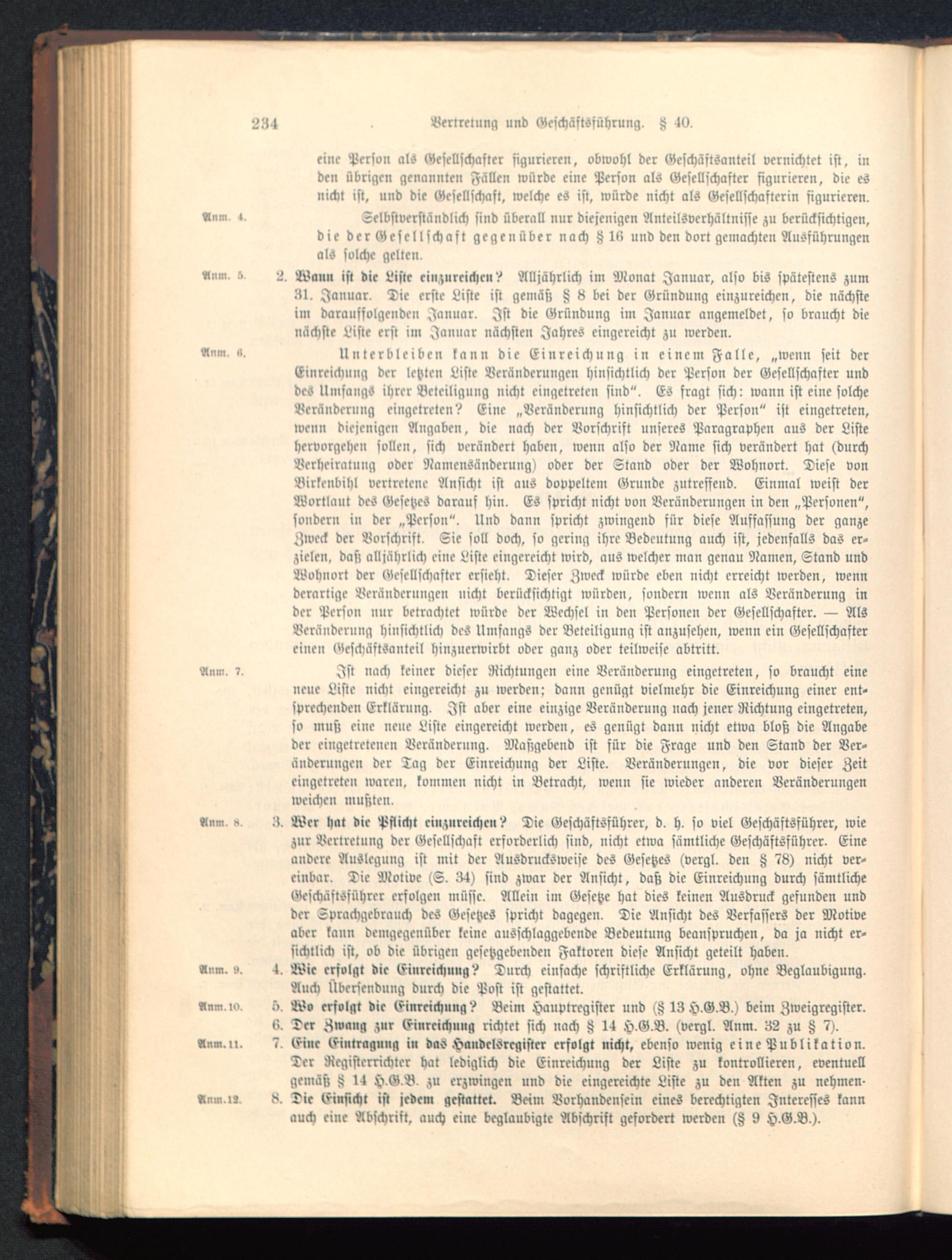 Einreichung der letzte» Liste Veränderungen hinsichtlich der Person der Gesellschafter unddes UmsangS ihrer Beteiligung nicht eingetreten sind". Es fragt sich: wann ist eine solcheVeränderung eingetreten? Eine „Veränderung hinsichtlich der Person" ist eingetreten,wenn diejenigen Angabc», die nach der Vorschrift unseres Paragraphen aus der Listehervorgehen sollen, sich verändert haben, wenn also der Name sich verändert hat (durchVerheiratung oder Namensänderung) oder der Stand oder der Wohnort. Diese vonBirlenbihl vertretene Ansicht ist aus doppeltem Grunde zutreffend. Einmal weist derWortlaut des Gesetzes daraus hin. Es spricht nicht von Veränderungen in den „Personen",sondern in der „Person". Und dann spricht zwingend für diese Auffassung der ganzeZweck der Vorschrift. Sie soll doch, so gering ihre Bedeutung auch ist, jedenfalls das er-zielen, das; alljährlich eine Liste eingereicht wird, aus welcher man genau Namen, Stand undWohnort der Gesellschafter ersieht. Dieser Zweck würde eben nicht erreicht werden, wennderartige Veränderungen nicht berücksichtigt würden, sondern wenn als Veränderung inder Person nur betrachtet würde der Wechsel in den Personen der Gesellschafter. — AlsVeränderung hinsichtlich des Umfangs der Beteiligung ist anzusehen, wenn ein Gesellschaftereinen Geschäftsanteil hinzuerwirbt oder ganz oder teilweise abtritt.Am». ?. Ist nach keiner dieser Richtungen eine Veränderung eingetreten, so braucht eine