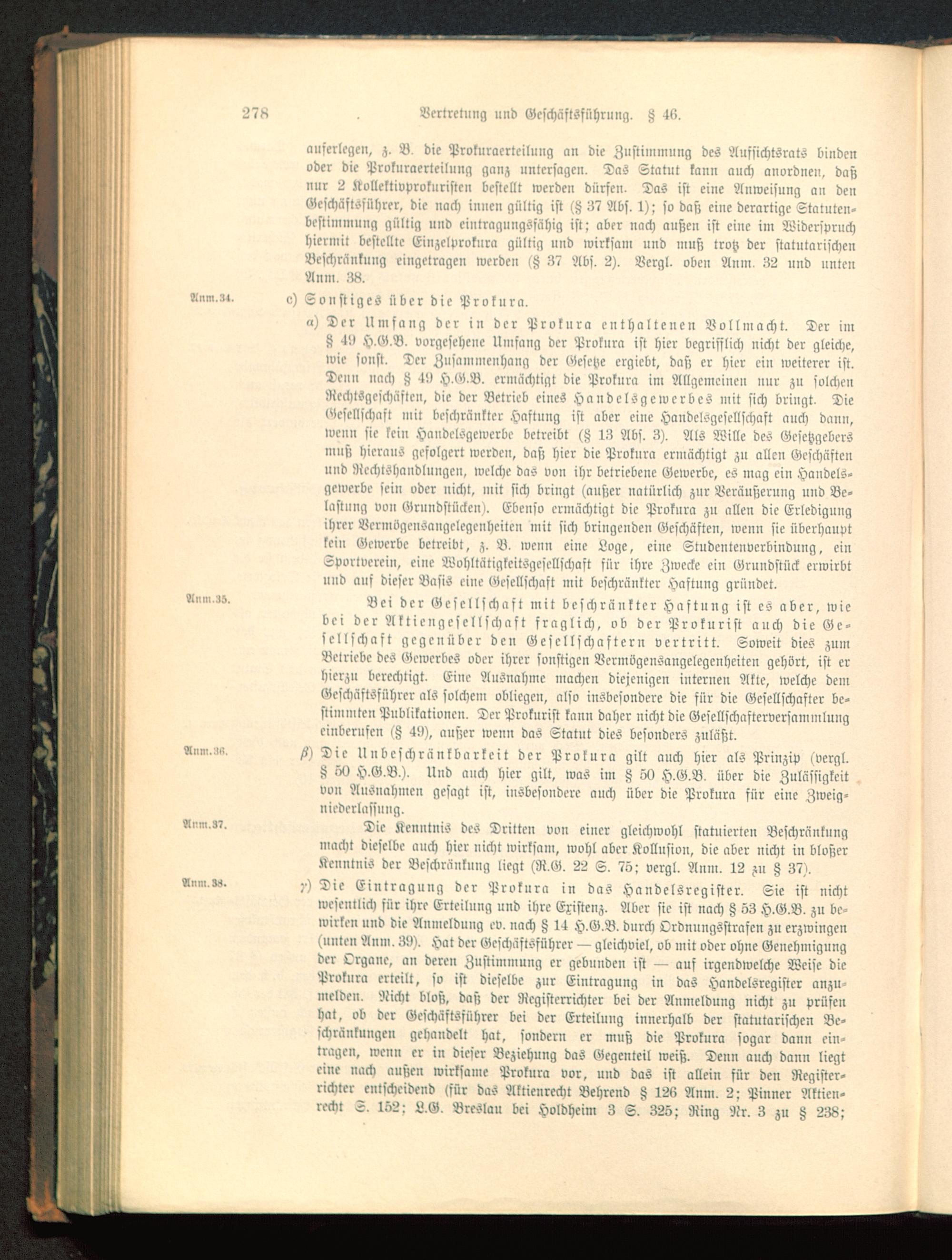 auferlegen, z, B, die Proturaerteilung an die Zustimmung des Aufsichtsrats bindenoder die Prokuraerteilung ganz untersagen. Das Statut kann auch anordnen, daßnur 2 Kollektivprokuristcn bestellt werden dürfe». Das ist eine Anweisung a» denGeschäftsführer, die nach innen gültig ist (8 37 Abs. 1); so daß eine derartige Statuten-bestimmung güllig und ciutragungsfähig ist' aber nach außen ist eine im Widerspruchhiermit bestellte Einzclprokura gültig und wirksam und muß trotz der statutarischenBeschränkung eingetragen werden (§ 37 Abs, 2). Bergl. oben Anm 32 und untenAnm, 3«.