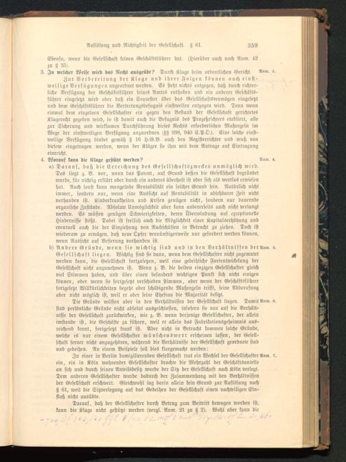 Die Gründe müssen aber in den Verhältnissen der Gesellschaft liegen. Damit Am»,sind persönliche Gründe nicht absolut ausgeschlossen, insofern sie nur auf die Verhält-nisse der Gesellschaft zurückwirken, wie z. B. wenn derjenige Gesellschafter, der alleinimstande ist, die Geschäfte zu führen, weil er allein das Fabrikationsgeheimnis aus-reichend kennt, sortgesetzt krank ist. Aber nicht in Betracht kommen solche Gründe,welche es nur einem Gesellschafter wünschenswert erscheinen lassen, der Gesell-schaft ferner nicht anzugehören, während die Verhältnisse der Gesellschaft geordnete sindund gedeihen. An einem Beispiele soll dies klargemacht werden: