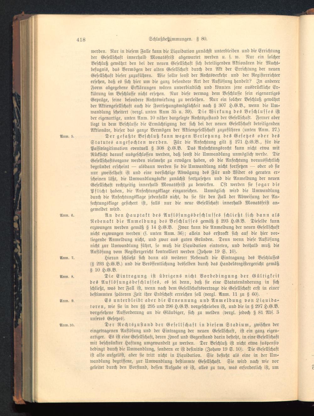 eingetragenen Auflösung und der Eintragung der neuen Gesellschaft, ist ein ganz eigen-artiger. Es ist eine Gesellschaft, deren Zweck und Gegenstand darin besteht, in eine Gesellschaftmit beschränkter Hastung umgewandelt zu werden. Der Beschluß ist nicht etwa suspcnsivbedingt durch die Umwandlung, sondern er ist definitiv (Johow 19 S. 19). Die Gesellschaftist also ausgelost, aber sie tritt nicht in Liquidation. Sie besteht als eine in der Um-ivandlung begriffene, zur Umwandlung bestimmte Gesellschaft. Sie wird nach wie vorgeleitet durch den Vorstand, dessen Aufgabe es ist, alles zu tun, was erforderlich ist, um