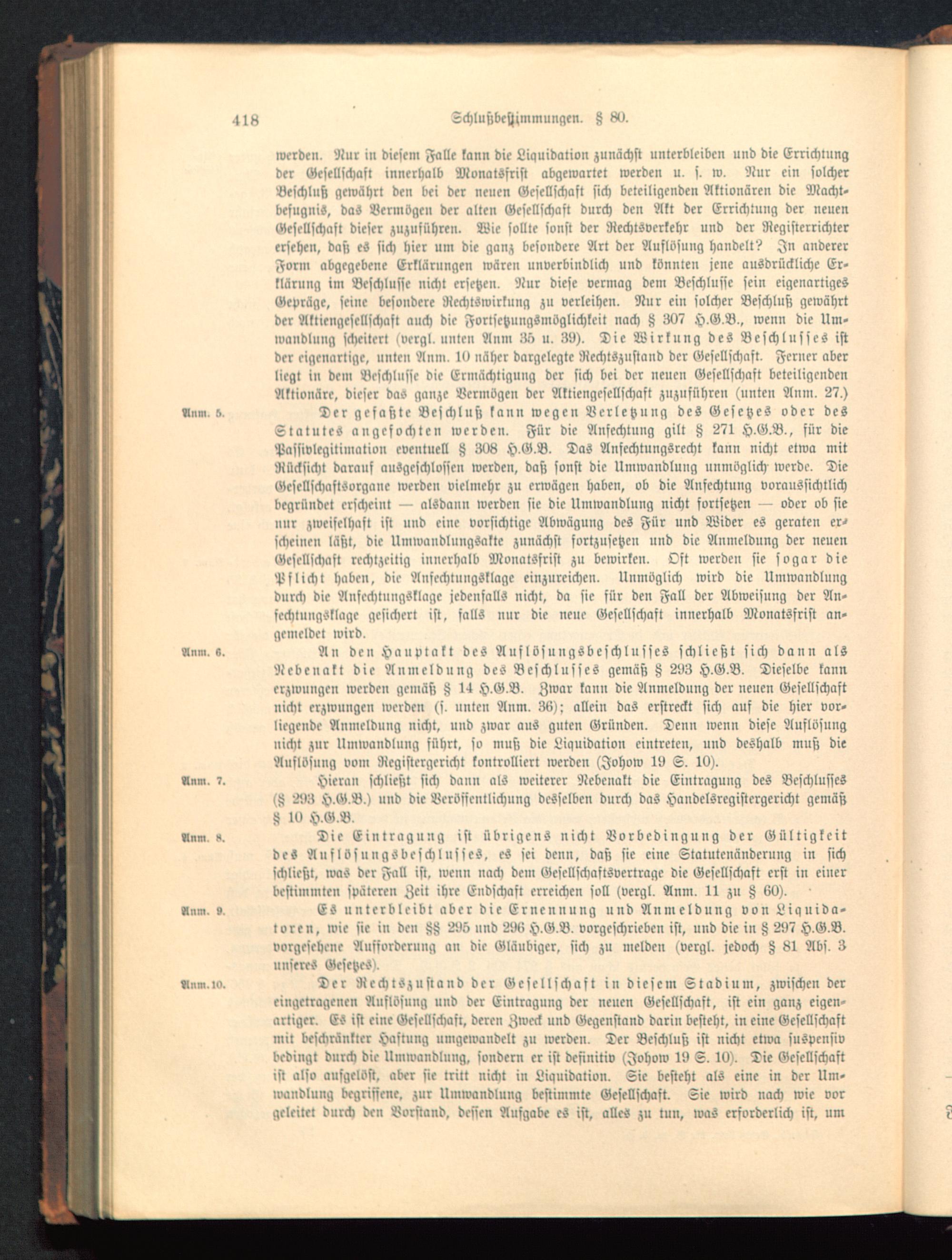 werde». Nur i» diesem Falle kann die Liquidation zunächst unterbleiben und die Errichtungder Gesellschaft innerhalb Monaissrist abgewartet werden u. s. w. Nur ein solcherBeschluß gewährt den bei der neuen Gesellschaft sich beteiligenden Aktionären die Macht-befugnis, das Vermöge» der alten Gesellschaft durch den Akt der Errichtung der neuenGesellschaft dieser zuzuführen. Wie sollte sonst der Rechtsverkehr und der Rcgisterrichterersehen, das; eS sich hier um die ganz besondere Art der Auflösung handelt? In andererForm abgegebene Erklärungen wären unverbindlich und könnten jene ausdrückliche Er-klärung im Beschlusse nicht ersetzen. Nur diese vermag dem Beschlusse sein eigenartigesGepräge, seine besondere Rechtswirkung zu verleihen. Nur ein solcher Beschluß gewährtder Aktiengesellschaft auch die Fortsctzungsmöglichkcit nach 8 307 H.G.B., wenn die Um-wandlung scheitert (vergl. unten Anm 85 u. 39). Die Wirkung des Beschlusses istder eigenartige, unten Anm. 10 näher dargelegte Rcchtszustand der Gesellschaft. Ferner aberliegt in dem Beschlusse die Ermächtigung der sich bei der neuen Gesellschaft beteiligendenAktionäre, dieser das ganze Vermögen der Aktiengesellschaft zuzuführen (unten Anm. 27.)