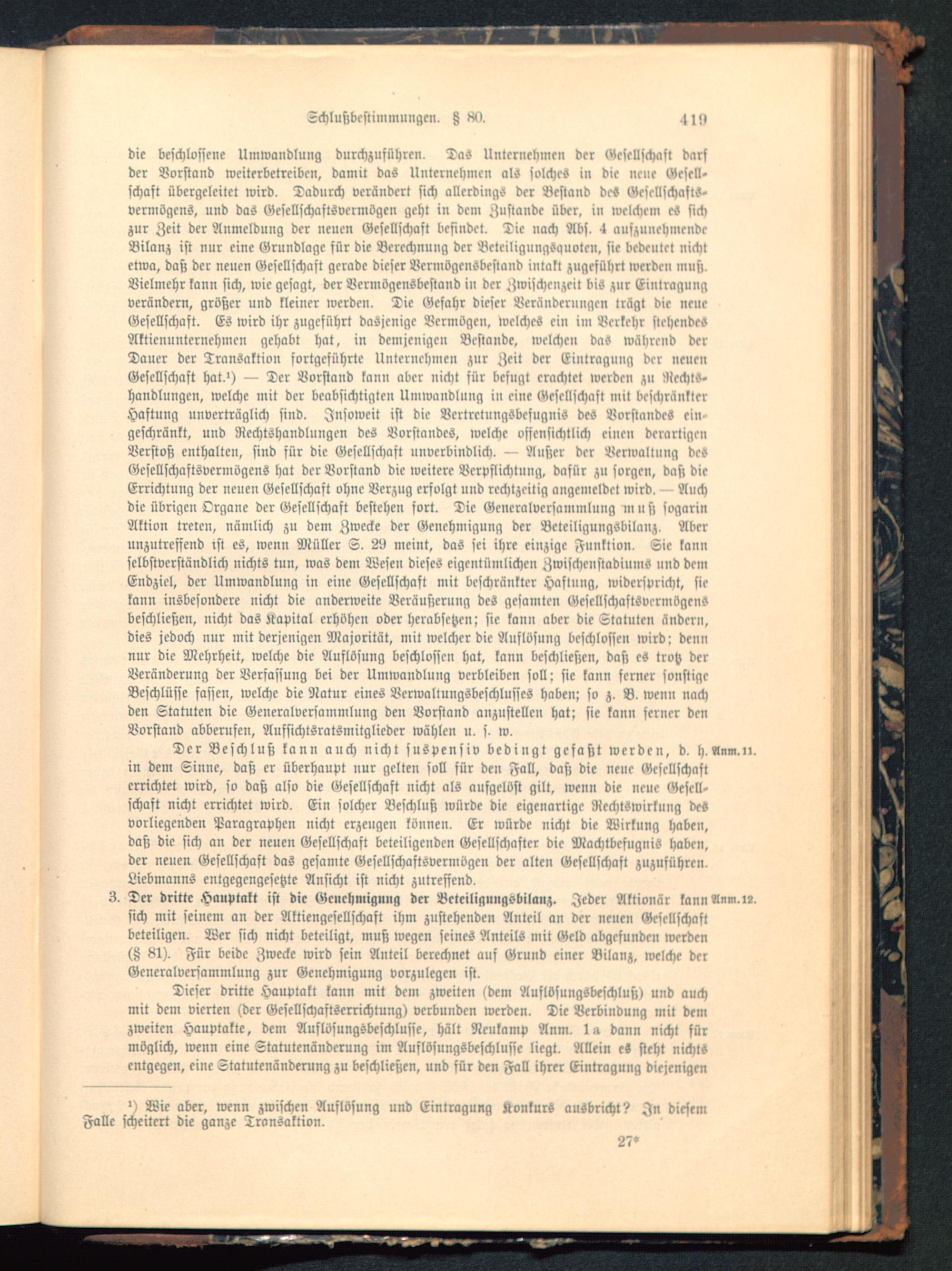 3. Der dritte Hanptakt ist die Genehmigung der Bctciliguugsbilauz. Jeder Aktionär kannAnm.l?.sich mit seinem an der Aktiengesellschaft ihm zustehenden Anteil an der neuen Gesellschaftbeteiligen. Wer sich nicht beteiligt, muß wegen seines Anteils mit Geld abgefunden werden(Z 81). Für beide Zwecke wird sein Anteil berechnet auf Grund einer Bilanz, welche derGeneralversammlung zur Genehmigung vorzulegen ist.