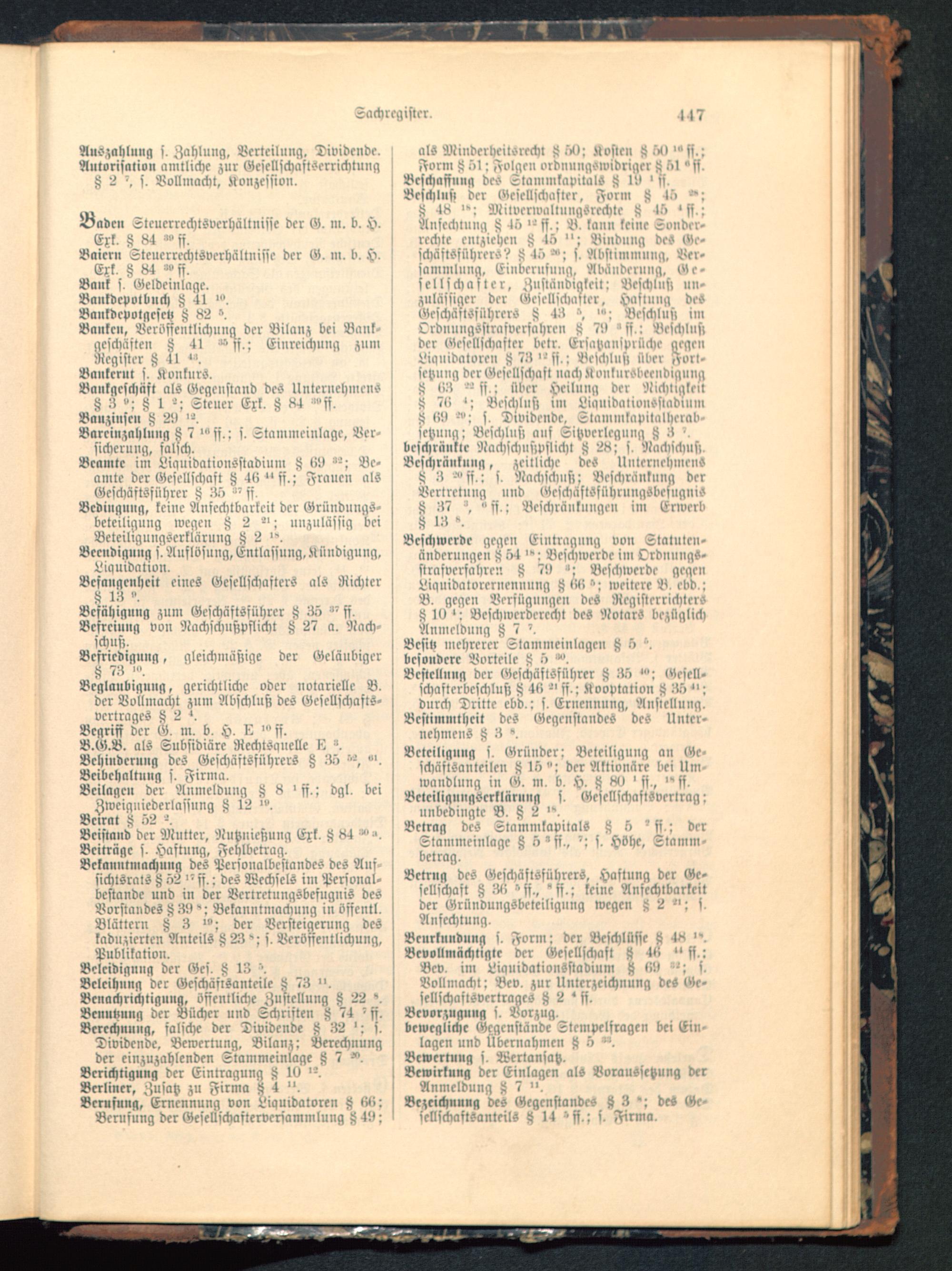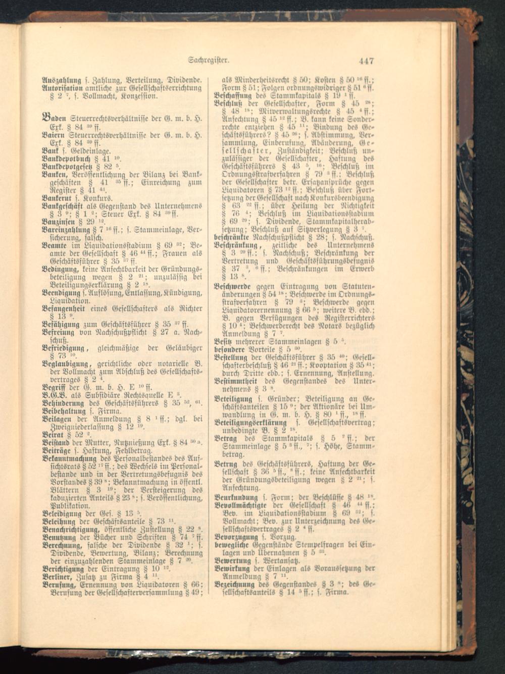 Beleidigung der Ges. 8 48Belcihung der Geschäftsanteile 8 73 ".Benachrichtigung, öffentliche Zustellung 8 22 '.Bciiuttuug der Bücher und Schriften 8 74 'ff.Berechnung, falsche der Dividende 8 82 '; f.Dividende. Bewertung, Bilanz; Berechnungder einzuzahlenden Stammeinlage 8 7Berichtigung der Eintragung 8 >9Berliner, Zusatz zu Firma 8 4"-Berufung, Ernennung von Liquidatoren 8 86:Benisung der GeseUschaslervcrsammlung 849;