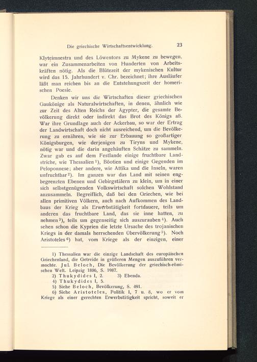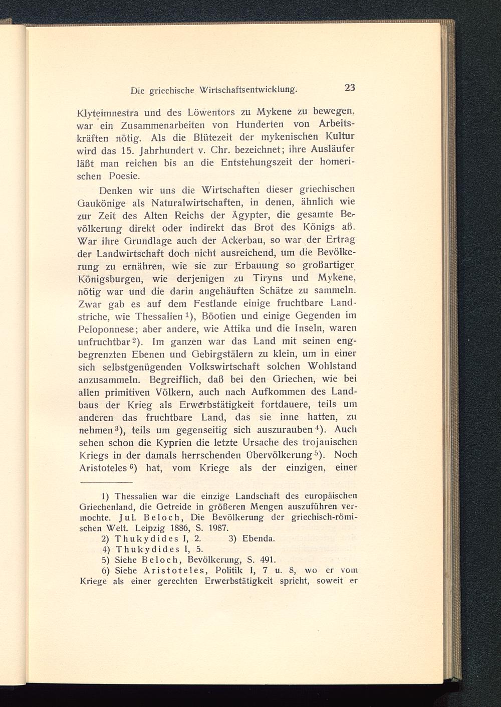 Denken wir uns die Wirtschaften dieser griechischenGaukönige als Naturalwirtschaften, in denen, ähnlich wiezur Zeit des Alten Reichs der Ägypter, die gesamte Bervölkerung direkt oder indirekt das Brot des Königs aß.War ihre Grundlage auch der Ackerbau, so war der Ertragder Landwirtschaft doch nicht ausreichend, um die Bevölke-rung zu ernähren, wie sie zur Erbauung so großartigerKönigsburgen, wie derjenigen zu Tiryns und Mykene ,nötig war und die darin angehäuften Schätze zu sammeln.Zwar gab es auf dem Festlande einige fruchtbare Land-striche, wie Thessalien * * * 4 ), Böotien und einige Gegenden imPeloponnese; aber andere, wie Attika und die Inseln, warenunfruchtbar 2 ). Im ganzen war das Land mit seinen eng-begrenzten Ebenen und Gebirgstälern zu klein, um in einersich selbstgenügenden Volkswirtschaft solchen Wohlstandanzusammeln. Begreiflich, daß bei den Griechen, wie beiallen primitiven Völkern, auch nach Aufkommen des Land-baus der Krieg als Erwdrbstätigkeit fortdauere, teils umanderen das fruchtbare Land, das sie inne hatten, zunehmen 3 ), teils um gegenseitig sich auszurauben 4 ). Auchsehen schon die Kyprien die letzte Ursache des trojanischenKriegs in der damals herrschenden Übervölkerung 5 ). NochAristoteles 6 ) hat, vom Kriege als der einzigen, einer