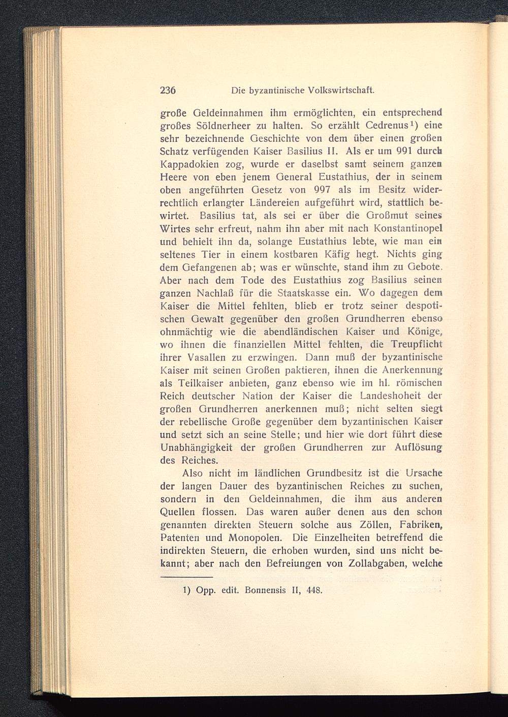 große Geldeinnahmen ihm ermöglichten, ein entsprechendgroßes Söldnerheer zu halten. So erzählt Cedrenus 1 ) einesehr bezeichnende Geschichte von dem über einen großenSchatz verfügenden Kaiser Basilius II . Als er um 991 durchKappadokien zog, wurde er daselbst samt seinem ganzenHeere von eben jenem General Eustathius, der in seinemoben angeführten Gesetz von 997 als im Besitz wider-rechtlich erlangter Ländereien aufgeführt wird, stattlich be-wirtet. Basilius tat, als sei er über die Großmut seinesWirtes sehr erfreut, nahm ihn aber mit nach Konstantinopelund behielt ihn da, solange Eustathius lebte, wie man einseltenes Tier in einem kostbaren Käfig hegt. Nichts gingdem Gefangenen ab; was er wünschte, stand ihm zu Gebote.Aber nach dem Tode des Eustathius zog Basilius seinenganzen Nachlaß für die Staatskasse ein. Wo dagegen demKaiser die Mittel fehlten, blieb er trotz seiner despoti-schen Gewalt gegenüber den großen Grundherren ebensoohnmächtig wie die abendländischen Kaiser und Könige,wo ihnen die finanziellen Mittel fehlten, die Treupflichtihrer Vasallen zu erzwingen. Dann muß der byzantinischeKaiser mit seinen Großen paktieren, ihnen die Anerkennungals Teilkaiser anbieten, ganz ebenso wie im hl. römischenReich deutscher Nation der Kaiser die Landeshoheit dergroßen Grundherren anerkennen muß; nicht selten siegtder rebellische Große gegenüber dem byzantinischen Kaiserund setzt sich an seine Stelle; und hier wie dort führt dieseUnabhängigkeit der großen Grundherren zur Auflösungdes Reiches.