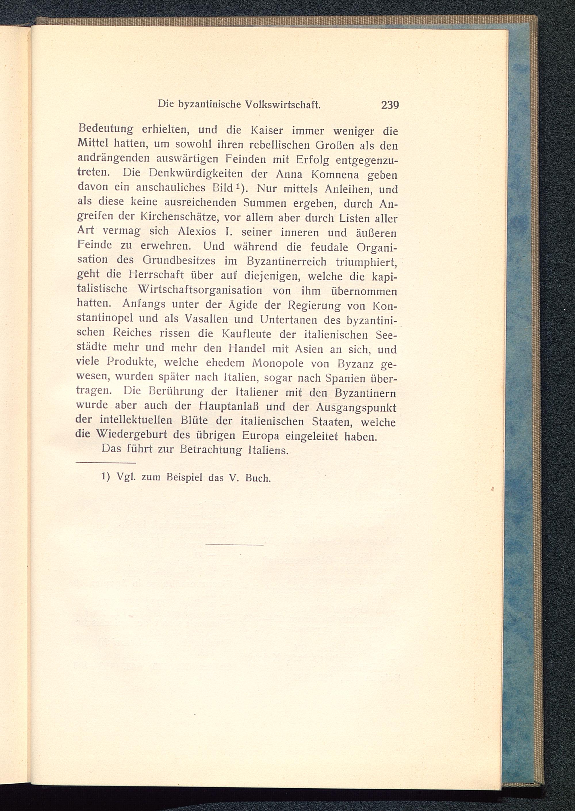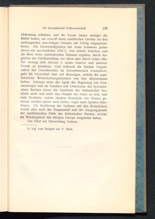Bedeutung erhielten, und die Kaiser immer weniger dieMittel hatten, um sowohl ihren rebellischen Großen als denandrängenden auswärtigen Feinden mit Erfolg entgegenzu-treten. Die Denkwürdigkeiten der Anna Komnena gebendavon ein anschauliches Bild 1 ). Nur mittels Anleihen, undals diese keine ausreichenden Summen ergeben, durch An-greifen der Kirchenschätze, vor allem aber durch Listen allerArt vermag sich Alexios I. seiner inneren und äußerenFeinde zu erwehren. Und während die feudale Organi-sation des Grundbesitzes im Byzantinerreich triumphiert,geht die Herrschaft über auf diejenigen, welche die kapi-talistische Wirtschaftsorganisation von ihm übernommenhatten. Anfangs unter der Ägide der Regierung von Kon-stantinopel und als Vasallen und Untertanen des byzantini-schen Reiches rissen die Kaufleute der italienischen See-städte mehr und mehr den Handel mit Asien an sich, undviele Produkte, welche ehedem Monopole von Byzanz ge-wesen, wurden später nach Italien, sogar nach Spanien über-tragen. Die Berührung der Italiener mit den Byzantinernwurde aber auch der Hauptanlaß und der Ausgangspunktder intellektuellen Blüte der italienischen Staaten, welchedie Wiedergeburt des übrigen Europa eingeleitet haben.