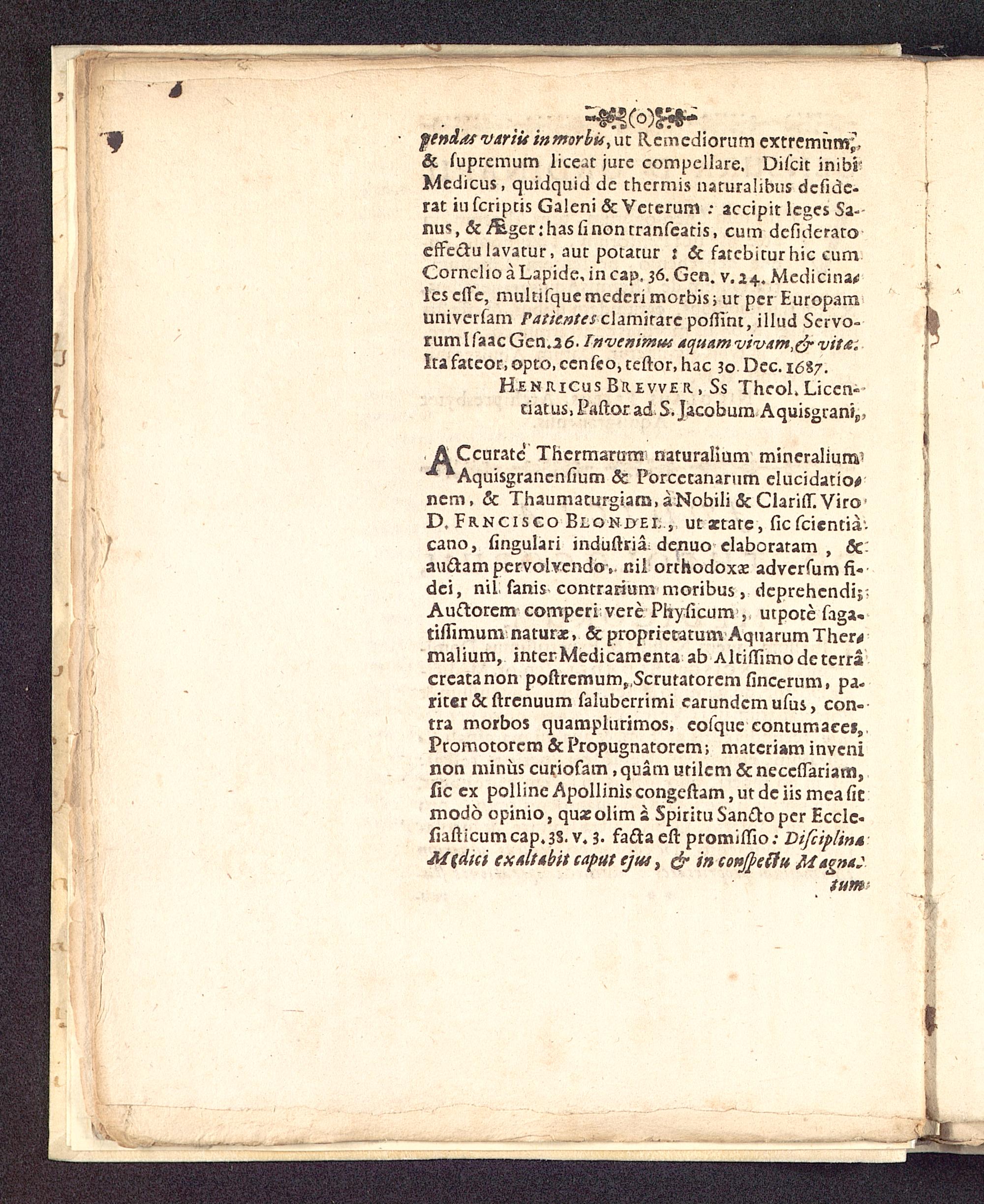"**Aquisgranenfium & Porcecanarum elucidario*nem, & Thaumaturgiarn, aNobili 5c Clariff ViroD.Frncisco Blondel , utztate, fic fcientia/.cano, fingulari induftria denuo elaboratam , Scau&ervolvcndoy nii orthodoxae adverfumfv»dci, nil fanis contrarium moribus , deprehcndij;Au&orcm comperi vere Phyficum , utpote faga-tiffimum naturx, & proprietatum AquarumTher*malium, interMedicamenta ab Altiffimodetcrraicreatanon poftremum t ,Scruratorcm fincerum, pa-riter <5c ftrenuum faluberrimi carundcmufus, con-tra morbos quamplurimos, cofque contumace*,.Promotorcm Sc Propugnatorem; matcriam inveninon minus curiofam ,quam urilem &neccffariatn,fic ex pollinc Apolliniscongeftam, ut dc iis mcaficmodo opinio, quaiolim a SpirituSantloper Eccle«fiafticum cap. 3S. v. 3- fa&a eft promiffio: Difciplin*Mfdtc/ cxdt*Ut caput tjut^ & in conffeftu Mdgna: