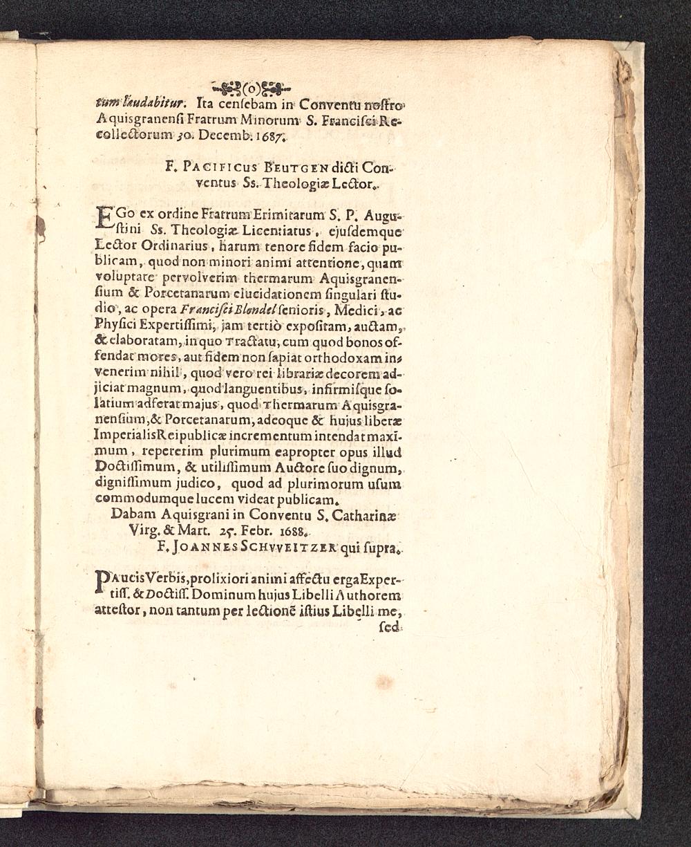 "C"Go ex ordineFhtrumErimitarum S. P, Augu-—'ftini Ss. Theologiat Liccnfiatus, ejufdemqueLcdtor Ordinarius, harum tenorcfidem facio pu-bliram, quod non minori animi atrcnrionc,quarnvoiuptare pcrvolverim thcrmarum Aquisgranen-fium Sc Porcctanarum clucidationcm fingulari ftu-dio, ac opera Francifci Elsndd fcnxoxh , Medici 3 acPhyfici Expcrtiflimi, jam tcrtio cxpofitam, JtuCtam s&claboratam,inquo rradatu,cum quodbonosof-fendac morcs, aut fidcm non fapiat orrhodoxamin*vcnerim nihil, quod vcro rei librariacdecorem ad-jiciat magnum, quod Janguentibus, infirmifque fo-latium adfcrat majus, quod Thcrmarum Aquisgra-ncnfium,& Porcetanarum,adcoquc & hujuslibera;ImperialisReipublicaeincrcmcntumintcndatmaxi-mum , repererim plurimum eaproptcr opus illudDo&iffimum, & utihfiimum Au&orefuodignum,digniflimum judico, quod ad plurimorum ufumcommodumqueluccm videat publicam»