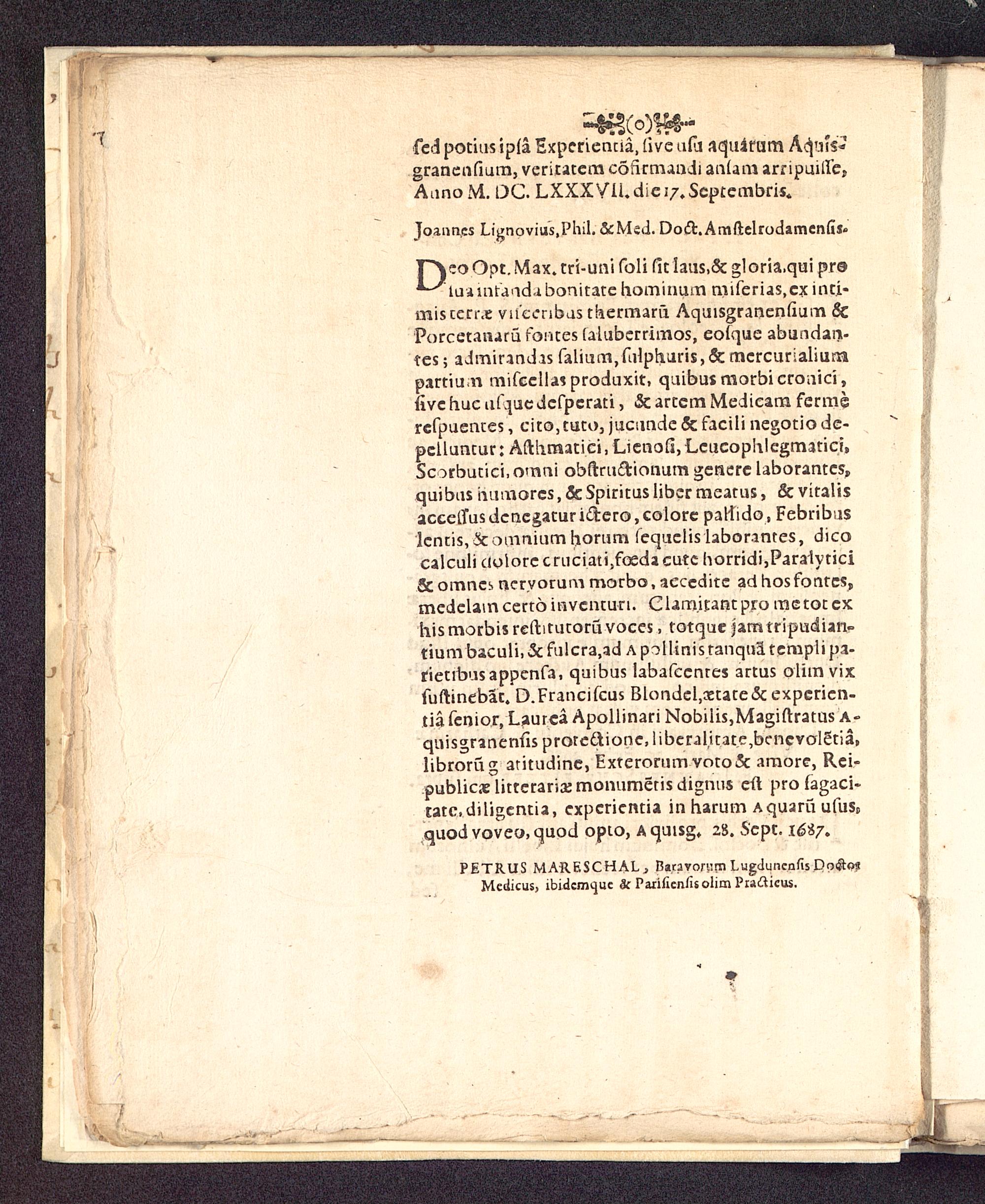 T^\eo Opt. Max. tri-uni foli fit laus,& gl oria.qui pro*-^Luaintand.ibonitate hominum miferias.cx int.i-miscerr.E viicenbas taermaru Aquisgranenfium &Porcctanaru forites [alubcrrimos, eolque abundan-tes; admirindis falium } fulphuri$,& mcrcurialiurapartium mifcellas produxit, quibusmorbicronici,fivchucufquedcfpcrati, &artemMedieam fermerefpuences, cito,tuto, jucundc & facili negotio dc-pclluncur: Afthmatici, Lienofi, Lcucophlegmatici,Scorbutici.omni obftru&ionum gencrc laborantes,quibus humorcs, & Spiritus liber meatus, & vitalisaccelTus dcncgatur ictero, colore paliido, Febribuslcntis,&omniumhorum fequclis laborantes, dicocalculi ciolorecriiciati,fosdacutc horridi,Paralytici& omncs ncryorum morbo, aeceditc ad hos fontcs,medelamcertdinvcnturt. Clam.itantpro mctoccxhismorbisreftitutoru voces, totque jamtripudian-tium baculi, & fulcra,ad a pollinis tanqua templi pa-rietibusappcnfa, quibus labafccnres artus olimvixfuftinebat. D.Francifcus Blondel,xtate&expcrien-tia fcnior, Laurca Apollinari Nobilis,Magiftratus A-quisgranenfis prorecvtione, liberalitate,bcneval5tia,librorus; atitudine, Exterorum voto& amorc, Rci-