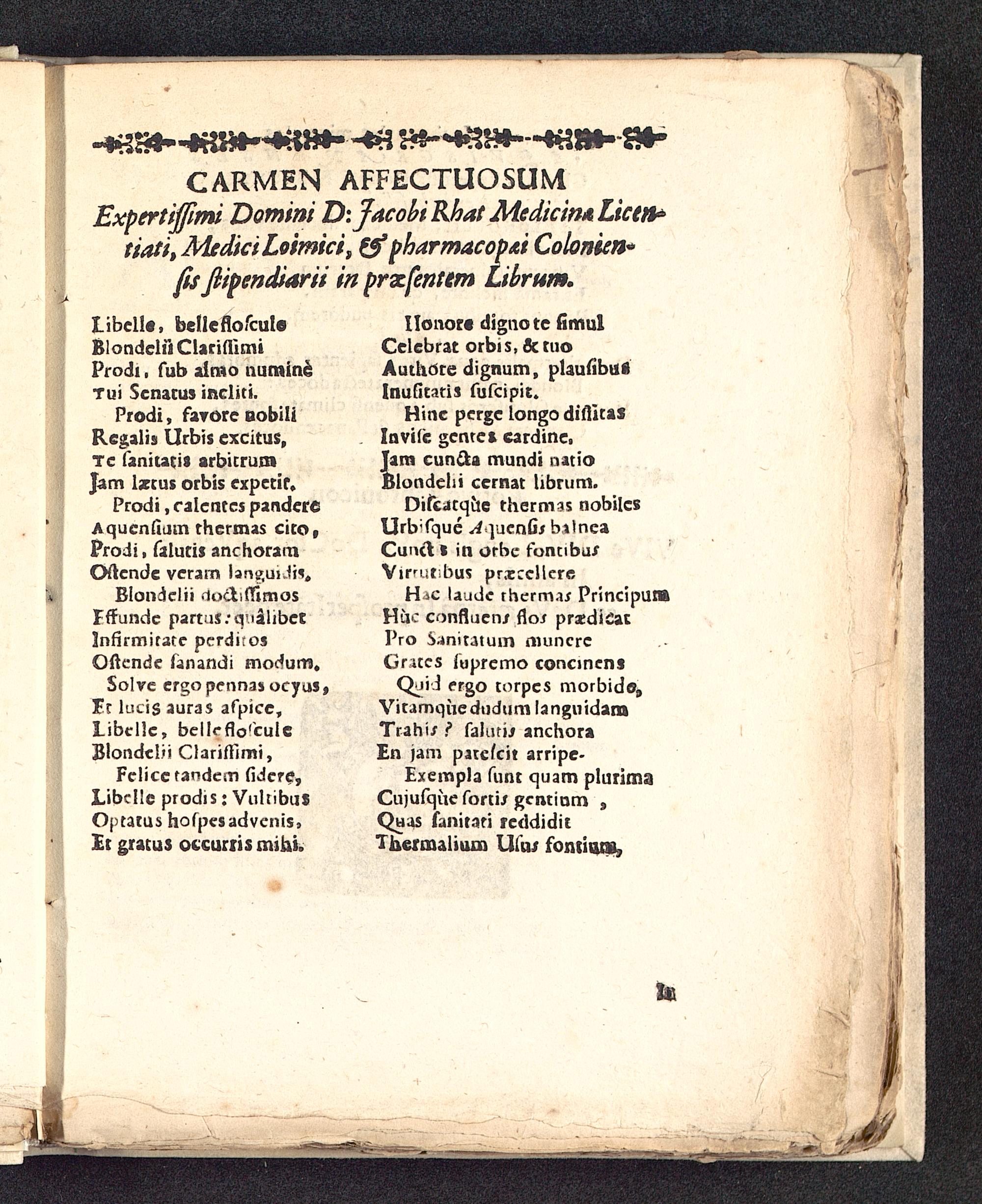 CARMEN AFFECTUOSUMExpertiffimi Domini D\JacobiKhat MedicimLicen^tiati,MediciLoimici s &pharmacopAiColonien*fisftipendiarii in prxfentem Librum.