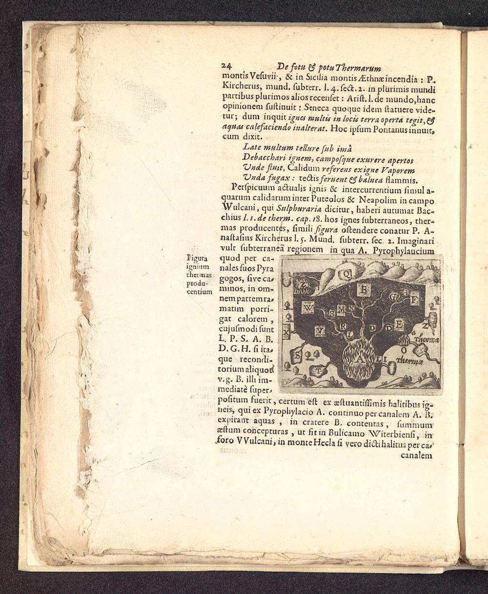 Late multum tellure fub imaDebacchari ignem, campofque exurire apertosUnde flnit, Calidum referens exigne VaporemUnda fugax: xe&isferuent & balnea flammis.Perfpicuum achialis ignis & intercurrentium fimul a-quarum calidaruminterPuteolos 8c Neapolim incampo"YVulcani, qui Sulphuraria dicitur, haberi autumat Bac-chius l.i.detherm. cap. /S.hos ignes (ubterraneos, ther-mas producentds, fimili figura oftendere conatur P. A-naftaiius Kircherus 1.5. Mund. fubterr. fec 2. Imaginarivult fubterranea regjonem in qua A.. Pyrophylaucium<]uod per ca-nalcsfuosPyragogos, five ca»mmos, in om-nempartemra» ;matim porri-gat calorem ,cujufmodifuntL. P. S. A. B.D.G.H. fiita,que recondi-torium aliquotiv.g. B. ilh im-mediate fuper.<pofitum fuerit, certum eft ex ffiftuantiflimis halitibus ig-neis, quiex Pyropliylacio A. continuopercanalcm A. ii.expiraut aquas , in cratere B. contentas , fummumasftum concepturas , ut fitin Bulicamo Witerbienfi, injforo VVulcanijin monteHecIafi verodictihalitusperca» -