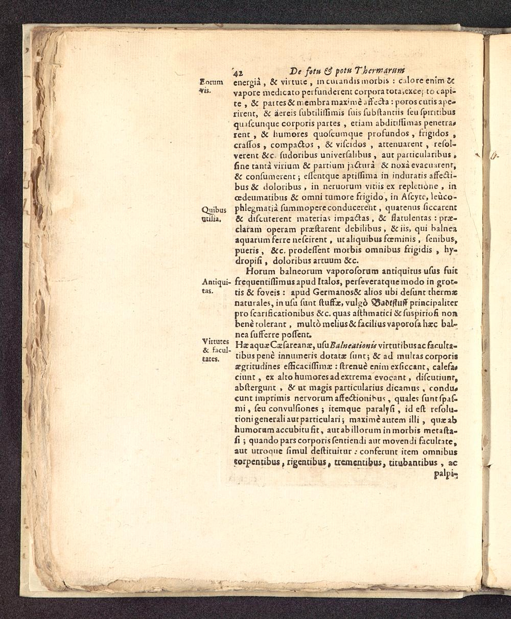 HxaquxCxfareanx, vx(uBalneationts virtutibiisacfaculti-tibuspene innumeris dotatx funt; & ad miiltas corporisjegritudines efficaciffimx : ftrenue cnim exficcant, calefa»ciunt, cx altohumoresadcxtrema evocant, difcutiunr,abftergunc , & ut magis particularius dicamus , condu#cunt imprimis nervorum affectionihus, quales funtfpaf-nn , feu convulfiones ; itemque paralyfi , id eft refolu-tionigeneraliautparticulari; maximcaurem illi , quxabhumorumaccubitufit, autabillorum inmorbis metafta-ft ; quando parscorporisfenriendi aut movendi faculme,aut utroque fimul deftituitur .• conferunt item omnibus«orpensibus, rigentibus, tremencibus, ticabantibus , ac