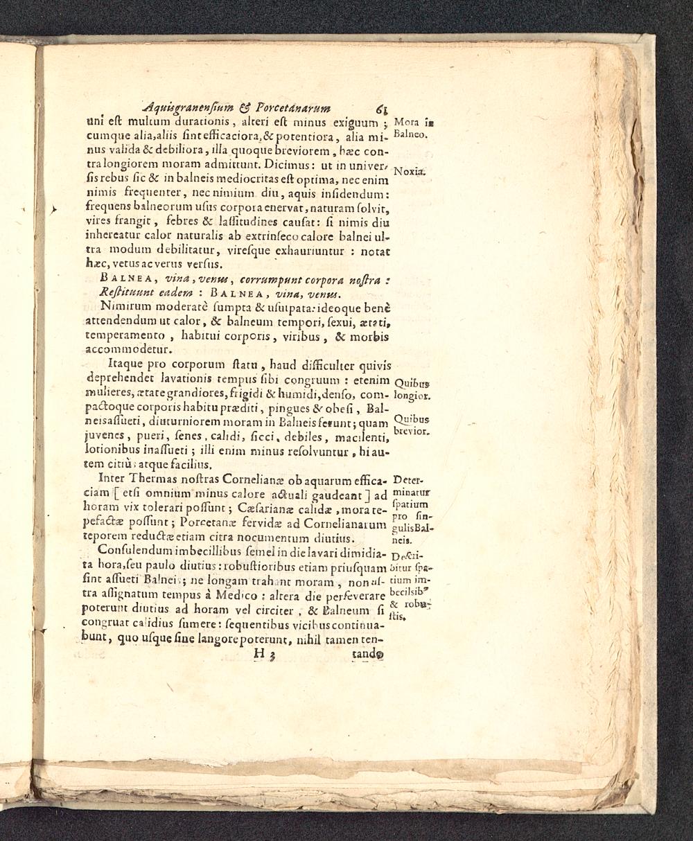 Aquisgrancnfium & Porcetdnarum 6"iuni eft mulcum durauonis , aireri eft minus exiguum ; Mora !■cumque alia,aliis fintefficaciora.&potentiora, alia mi- Balneo -nus valida6\:dtbiliora, illa qtioque brcviorem , hxc con-tralongiorem moram admittunr. Dicimus: ut in univer' 1^0^.,fisrebus fic& inbalneismediocritaseftoptima, necenimnimis freqiienter, necnitnium diu,aquis infidendum:frequens balneorum ufus corpotacnervar,naturam folvir,vires frangit, fcbres & laifitudines caufat: fi nimis diuinhereatur calor naturalis ab extrinfeco calore balneiul-tra modum dcbilitatur, virefque exhauriuntur : notach.cc, vetusac verus verfus.