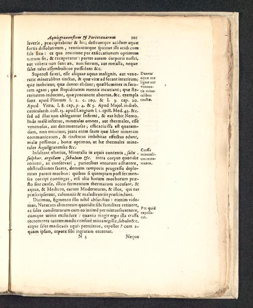 Supereft fateri, efte aliquas aquas mahgnis, aut vene-ratis mineralibus tinftas, & quaevitacadfcrantinteritum;qii£ inebrient; qtia dentes elidant; qu*Hosnines mfuro-rem agant; qaae ftupiditatem mentis incutiant; qua; fte-refltatero inducant, quxprocunent abortuj,&c. exemplafunt apud Plsnium h i. c. 10;. & 1. 3. cap. 20.Apud Vitru. 1.8. cap.^. 4. & 5. Apud Majol. »0 dieb.canicularib.colh 13. apudLangium 1.1. cpift. Med.43. &c.fesl ad tllasnon ablegantur Infirmi, & eas bibit Nemo.Inde maleinfcrtur, minerales omnes, aut thermalcs, efievenenofas, aut detnnientofas ; efficaciailla eft quarum-dam, nonomnium; juxta enim fuarn quac hbcr mineramcommunicatam, & tin&uras imbibitas effe&us edunr,niaia: peffimos , bona; optimos, ut hx thermales mine-rales Aquifgranenfes &o