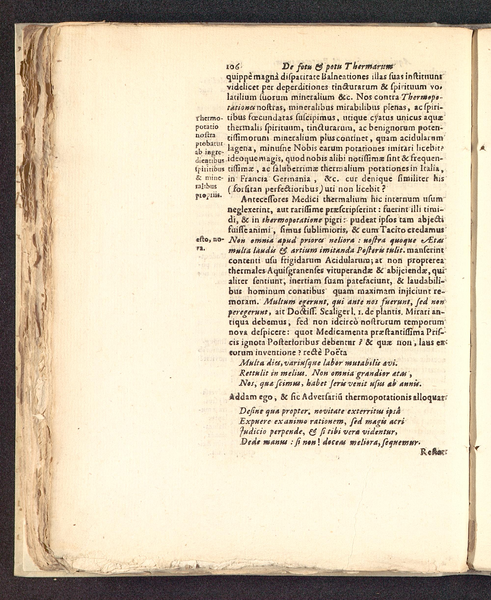 utibus.ideotjueiuagis, quodnobis aiibi notiffimas fint&frcquen-ifiritibus tiffimae , ac faluberrimse therraaiium potationesin Itaiia,& mine- j n Fraricia Germania , &c. cur deniquc fimiiitcr hisralibus ^ foilitan perfeclioribus ) uti non licebit ?j»i»p . AntccefTores Medici thermalium hic intirnum ufumneglexetint, aut rariffime prafcripfcrint: fuerint ill< tirui-di, 8c in thermopotatient 'pigrir pudeatipfos tam abjectifuiiTcanimi, fimus fublimioris, & cumTacrtocredamus«fto, no- JVon emnia apnd prtoret neliora : neflra tjuotjue ^Etiumulta laudis & artium imitanda Pofierit tulit. manferintconteim ufu frigidarum Acidularura; at non propterearhermale^Aquifgranenfes vituperanda: & abijciendaj,quialiter fcntiunt, iuertiam fuam patcfaciunt, & laudabili-bui hominum conatibus quam nlaximam injiciunr re=moram. Multum egerunt, tjui ante nos fuerunt, Jed ntnferegerunt , ait DoftifT. Scaligcrl. i.de plantis. Mirari an-tiqua debemus, fed non idcirco noftrorum temporumnova defpiccre: quot Medicamenta pra;ftantiffima Prif-cis ignota Poftedoribus debentnr / 5c qux 1T0H, laBS eKeorum inventione ? rcdre Poeta