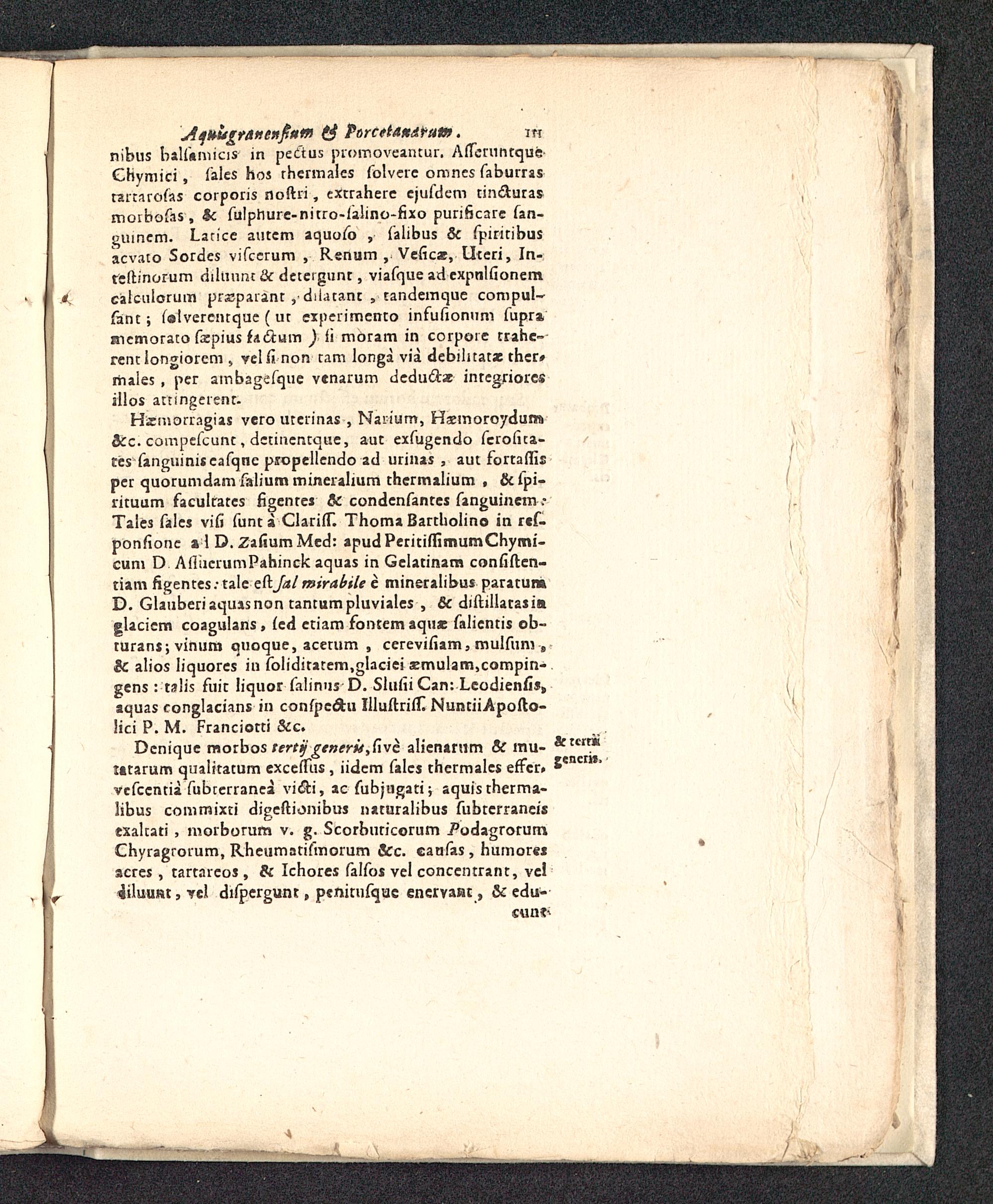 Hsmorragias vero uterinas , Nai-ium, Haemorovdumicc compefcunt, detincntque, aut exfugendo ferofita-tes fanguiniscafqnc propellendo ad urinas , aut fortaffisper quorumdam falium mineralmm thermalium , &fpi-rituum faculrates figenres & condenfantes fanguinem.-Tales falcs vifi funt a ClarifT. Thoma Bartholino in ref-ponfionc i 1 D. ZafiumMed: apud PeritiffimumChymi-cum D AiliicrumPahinck aquas in Gelatinam confiftcn-tiam figentes.-tale eft Jal mirabile e mineralibus paratumD. Glauberiaquasnon tantumpluviales , & diftillatasiaglacicm coagulans, fed ctiam fontem aquae falientis ob-turans;vinum quoque, acerum , cerevifiam, mulfum „& alios Iiquores iu folidiratem.glaciei 3emulam,compin-gens : talis fuit liquor falinus D. Slufii Can: Lcodienfi»,aquas conglacians in confpedtu UluftrifE NuntiiApofto-lici P. M. Franciotti &c.