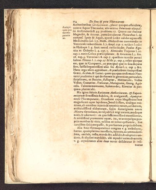 Authotitatibus iatisfaciamus , placct quoque oftenderevAatiqnir vcte rcs Aquas Thermalcs, ufu lnterno ?»tationu ufurpaf-thTmo 0 ^ CC Ariftoteles fedk 24. problemai/. Quairit cur thcrmx'Magnefitt, & Artanae , potufintidonea. Piutarchus 1. decompof. Ignis &C Aqux, apertc fcribit calidasaqtias eftcMedicinales.Gal. I.7. Meth, ^Wedendieas commendat inVentriculi imbecillicate. I. 7. fimpl. cap. 7. cafdertt 1 uidatin Hydrope 1. 4. fanit. tuend. rurfusfuadet. Paulus /£ge-nita ex Oribafio 1. 4. cap. 1. Alexander Trajanus 1.10.cap. r. easinColici prsefcripferunt, & Avicenna h j. fen.16. cap. j. Vitiuvius 1.8. cap. J. quafdam reccnfet potarifoiitas. Plinius.l. j. cap.i/. &lib. y>. cap, 3. refert quoquceas, quz inCampania , ac prarcipue qux in finuBayanofunt, fuiftefrequenrilfimi ufus Sic /Etius 1.1. cap 3. &c.Hunc ergo ufum approbant, & praefcribunt AntiquiiiimiGneci, Arabes,& Latini.-qaeniquoqueconfirruant Neo-terici praefertim ii qui derhcrrais in geiiere autparticulari,fcripferunr, ut Baccius, Fallopius , Mercurialis, VidiusVidius, Guanerius. Frafcatus, Motagnana, Georg. Agti-eola, Tabernemonranus, Solenandcr, Riverius Sc pcr-quam plurimialii.