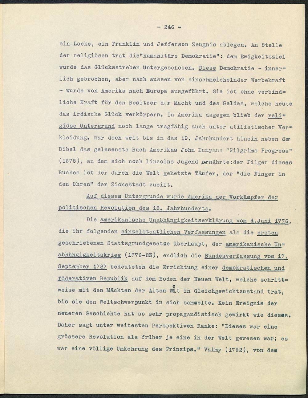 ein Locke, ein Franklin und Jefferson Zeugnis ablegen. An Stelleder religiösen trat die"humanitäre Demokratie": dem Ewigkeitszielwurde das Glücksstreben Untergeschoben. Diese Demokratie - inner=lieh gebrochen, aber nach aussen von einschmeichelnder Werbekraft- wurde von Amerika nach Europa ausgeführt. Sie ist ohne verbind^liehe Kraft für den Besitzer dtr Macht und des Geldes, welche heutedas irdische Glück verkörpern. In Amerika dagegen blieb der reli =giöse Untergrund noch lange tragfähig auch unter utilistischer Ver=kleidung. "ar doch weit bis in das 19. Jahrhundert hinein neben derBibel das gelesenste Buch Amerikas John Bunyans "Pilgrims Progress" (1675), an dem sich noch Lincolns Jugend ^?nährte:der Pilger diesesBuches ist der durch die Welt gehetzte Täufer, der "die Finger inden Ohren" der Zionsstadt zueilt.