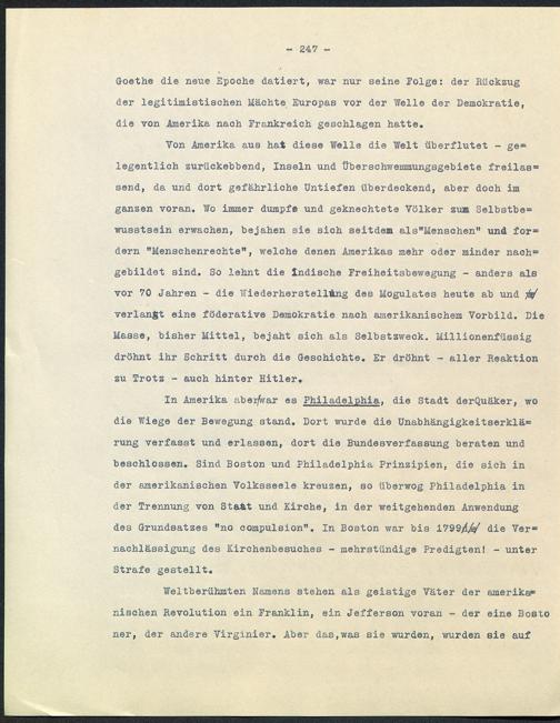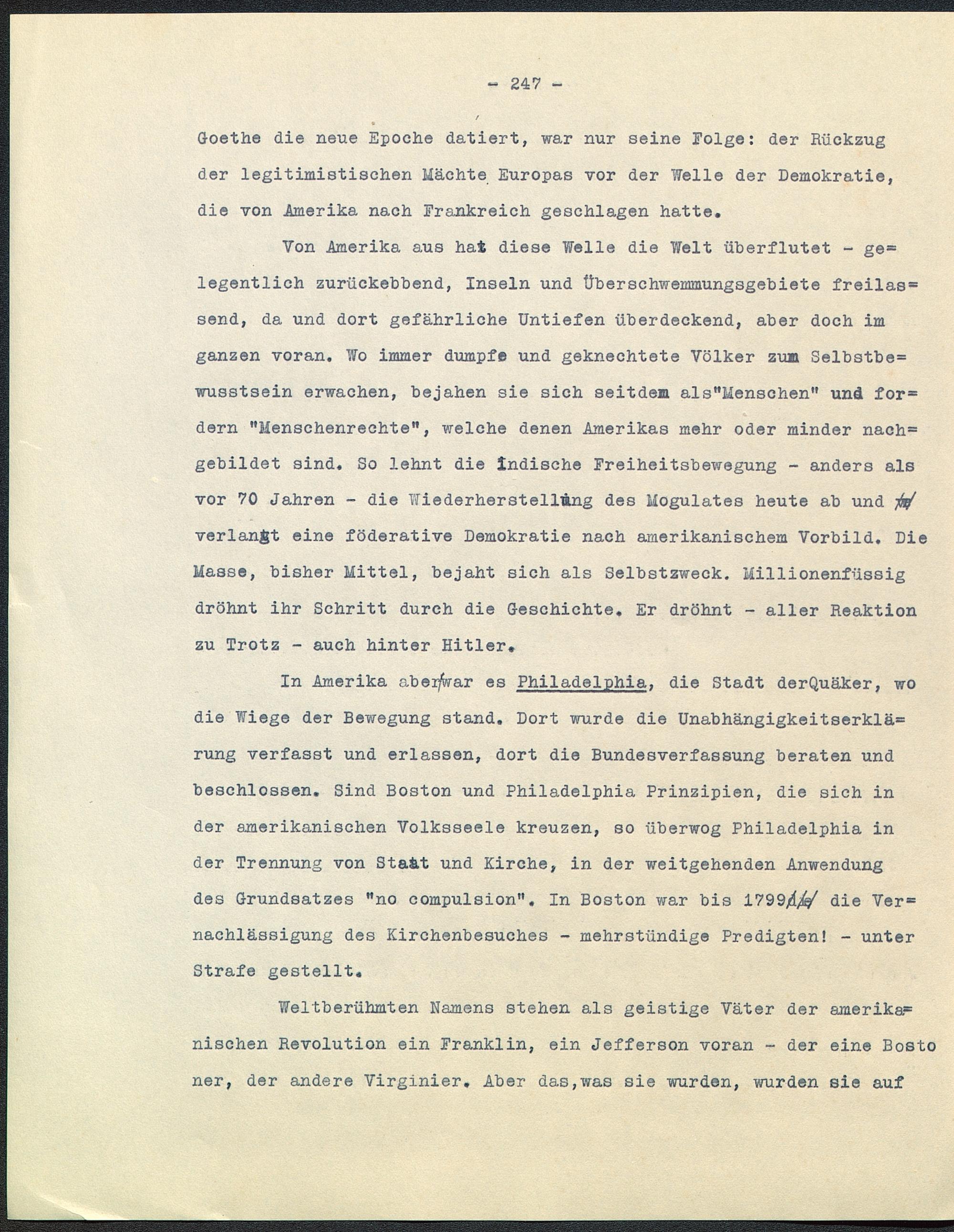 In Amerika abeijfwar es Philadelphia , die Stadt derQuäker, wodie Wiege der Bewegung stand. Dort wurde die Unäbhängigkeitserklä=rung verfasst und erlassen, dort die Bundesverfassung beraten undbeschlossen. Sind Boston und Philadelphia Prinzipien, die sich inder amerikanischen Volksseele kreuzen, so überwog Philadelphia inder Trennung von Sta&t und Kirche, in der weitgehenden Anwendungdes Grundsatzes "no compulsion". In Boston war bis 1799^^/ die Ver=nachlässigung des Kirchenbesuches - mehrstündige Predigten! - unterStrafe gestellt.