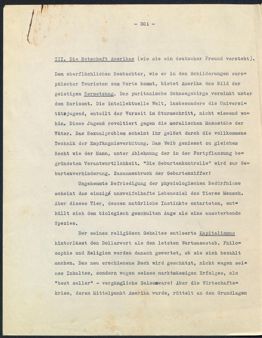 Der seines religiösen Gehaltes entleerte Kapitalismus hinterlässt den Dollarwert als den letzten Wertmassstab. Philo=sophie und Religion werden danach gewertet, ob sie sich bezahltmachen. Das neu erschienene Buch wird geschätzt, nicht wegen sei=nes Inhaltes, sondern wegen seines marktmässigen Erfolges, als"best seller" - vergängliche Saisonware! Aber die Wirtschafts=krise, deren Mittelpunkt Amerika wurde, rüttelt an den Grundlagen