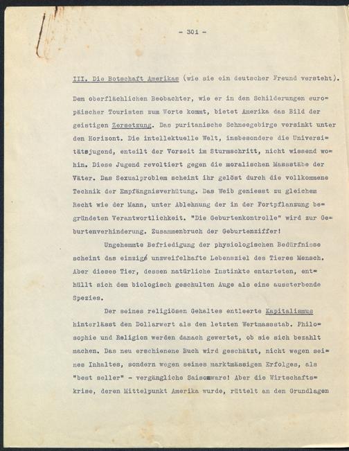Dem oberflächlichen Beobachter, wie er in den Schilderungen euro=päischer Touristen zum Worte kommt, bietet Amerika das Bild dergeistigen Zersetzung . Das puritanische Schneegebirge versinkt unterden Horizont. Die intellektuelle Welt, insbesondere die Universi=tätsjugend, enteilt der Vorzeit im Sturmschritt, nicht wissend wo=hin. Diese Jugend revoltiert gegen die moralischen Massstäbe derVäter. Das Sexualproblem scheint ihr gelöst durch die vollkommeneTechnik der Empfängnisverhütung. Das Weib geniesst zu gleichemRecht wie der Mann, unter Ablehnung der in der Fortpflanzung be=gründeten Verantwortlichkeit. "Die Geburtenkontrolle" wird zur Ge =burtenverhinderung. Zusammenbruch der Geburtenziffer!
