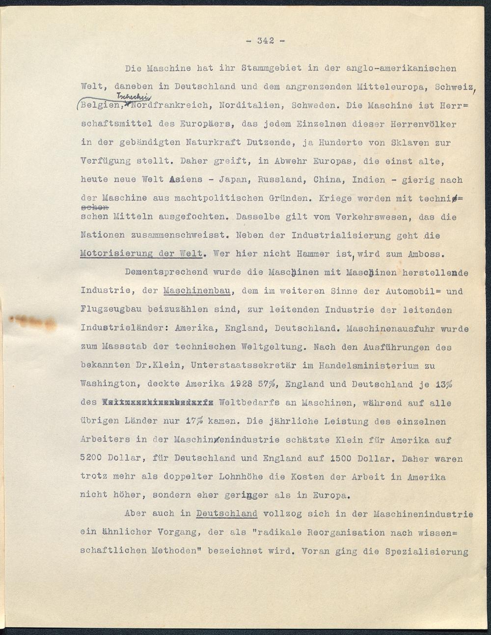 Die Maschine hat ihr Stammgebiet in der anglo-amerikanischenWelt, daneben in Deutschland und dem angrenzenden Mitteleuropa, Schweiz ^(Belgien,^Nordfrankreich, Norditalien, Schweden . Die Maschine ist Herr =schaftsmittel des Europäers, das jedem Einzelnen dieser Herrenvölkerin der gebändigten Naturkraft Dutzende, ja Hunderte von Sklaven zurVerfügung stellt. Daher greift, in Abwehr Europas , die einst alte,heute neue Welt Asiens - Japan, Russland , China, Indien - gierig nachder Maschine aus machtpolitischen Gründen. Kriege werden mit techni%=sehen Mitteln ausgefochten. Dasselbe gilt vom Verkehrswesen, das dieNationen zusammenschweisst. Neben der Industrialisierung geht .dieMotorisierung der Welt . Wer hier nicht Hammer ist^wird zum Amboss.