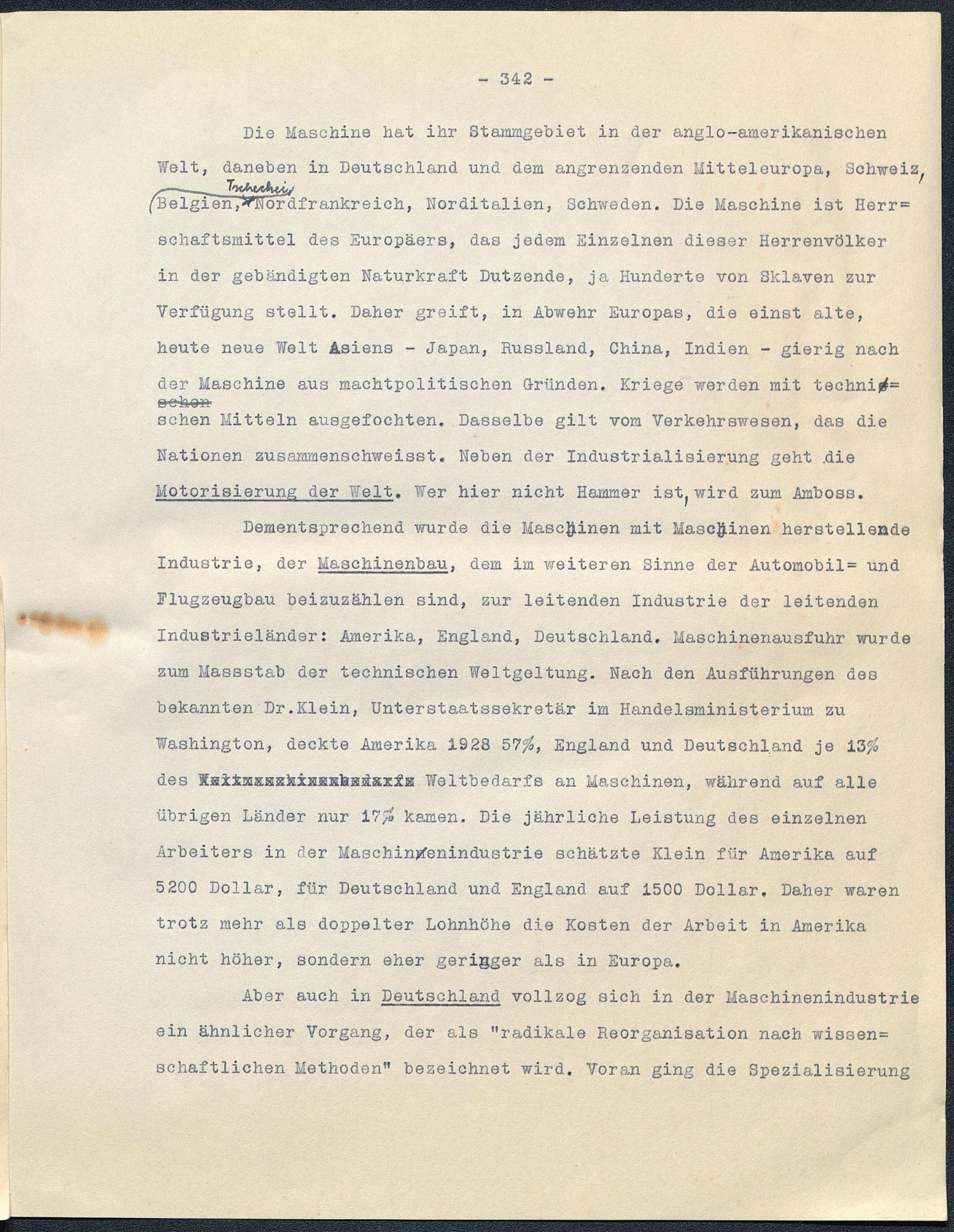 Dementsprechend wurde die Maschinen mit Maschinen herstellendeIndustrie, der Maschinenbau , dem im weiteren Sinne der Automobil= undFlugzeugbau beizuzählen sind, zur leitenden Industrie der leitendenIndustrieländer: Amerika, England, Deutschland . Maschinenausfuhr wurdezum Massstab der technischen Weltgeltung. Nach den Ausführungen desbekannten Dr.Klein, Unterstaatssekretär im Handelsministerium zuWashington, deckte Amerika 1928 57%, England und Deutschland je 13%des ngiimxgKhinENhgäaxiE Weltbedarfs an Maschinen, während auf alleübrigen Länder nur 17% kamen. Die jährliche Leistung des einzelnenArbeiters in der Maschin%enindustrie schätzte Klein für Amerika auf5200 Dollar, für Deutschland und England auf 1500 Dollar. Daher warentrotz mehr als doppelter Lohnhöhe die Kosten der Arbeit in Amerika nicht höher, sondern eher gerigger als in Europa .