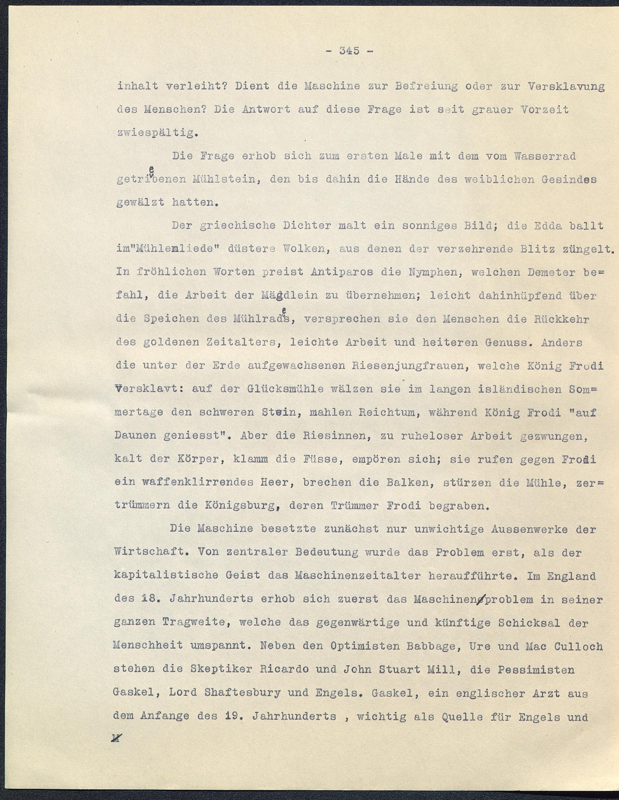 Die Maschine besetzte zunächst nur unwichtige Aussenwerke derWirtschaft. Von zentraler Bedeutung wurde das Problem erst, als derkapitalistische Geist das Haschinenzeitalter heraufführte. Im England des 18. Jahrhunderts erhob sich zuerst das Maschinen^problem in seinerganzen Tragweite, welche das gegenwärtige und künftige Schicksal derMenschheit umspannt. Neben den Optimisten Babbage, Ure und Mac Cullochstehen die Skeptiker Ricardo und John Stuart Mill , die PessimistenGaskel, Lord Shaftesbury und Engels. Gaskel, ein englischer Arzt ausdem Anfange des 19. Jahrhunderts , wichtig als Quelle für Engels und
