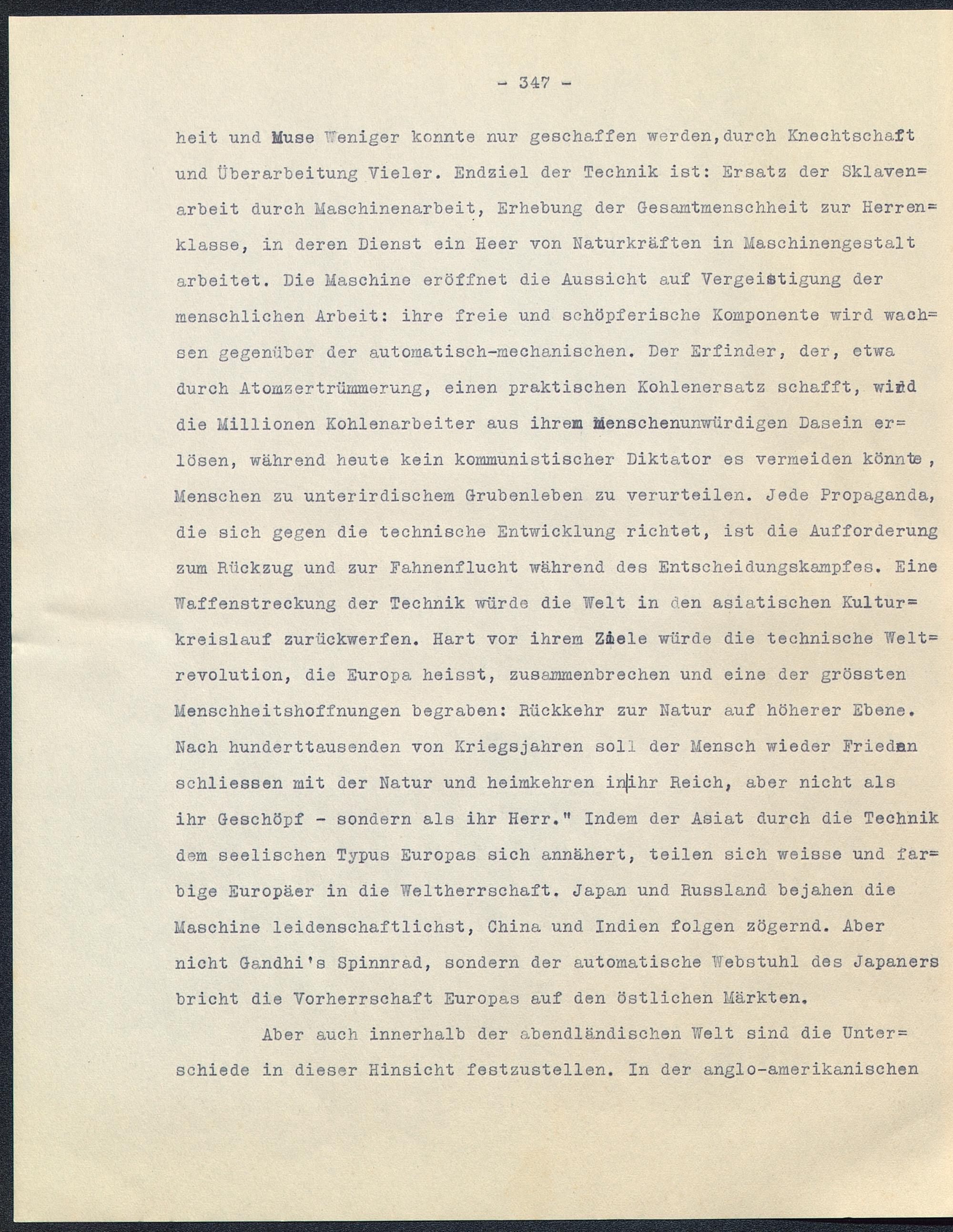 heit und Muse Weniger konnte nur geschaffen werden,durch Knechtschaftund Überarbeitung Vieler. Endziel der Technik ist: Ersatz der Sklaven=arbeit durch Maschinenarbeit, Erhebung der Gesamtmenschheit zur Herren^klasse, in deren Dienst ein Heer von Naturkräften in Maschinengestaltarbeitet. Die Maschine eröffnet die Aussicht auf Vergeistigung dermenschlichen Arbeit: ihre freie und schöpferische Komponente wird wach=sen gegenüber der automatisch-mechanischen. Der Erfinder, der, etwadurch Atomzertrümmerung, einen praktischen Kohlenersatz schafft, wiRddie Millionen Kohlenarbeiter aus ihrem Menschenunwürdigen Dasein er=lösen, während heute kein kommunistischer Diktator es vermeiden könnte,Menschen zu unterirdischem Grubenleben zu verurteilen. Jede Propaganda,die sich gegen die technische Entwicklung richtet, ist die Aufforderungzum Rückzug und zur Fahnenflucht während des Entscheidungskampfes. EineWaffenstreckung der Technik würde die Welt in den asiatischen Kultur=kreislauf zurückwerfen. Hart vor ihrem Ziele würde die technische Welt=revolution, die Europa heisst, zusammenbrechen und eine der grösstenMenschheitshoffnungen begraben: Rückkehr zur Natur auf höherer Ebene.Nach hunderttausenden von Kriegsjahren soll der Mensch wieder Friedan schliessen mit der Natur und heimkehren injihr Reich, aber nicht alsihr Geschöpf - sondern als ihr Herr." Indem der Asiat durch die Technikdem seelischen Typus Europas sich annähert, teilen sich weisse und far=bige Europäer in die Weltherrschaft. Japan und Russland bejahen dieMaschine leidenschaftlichst, China und Indien folgen zögernd. Abernicht Gandhi's Spinnrad, sondern der automatische Webstuhl des Japanersbricht die Vorherrschaft Europas auf den östlichen Märkten.