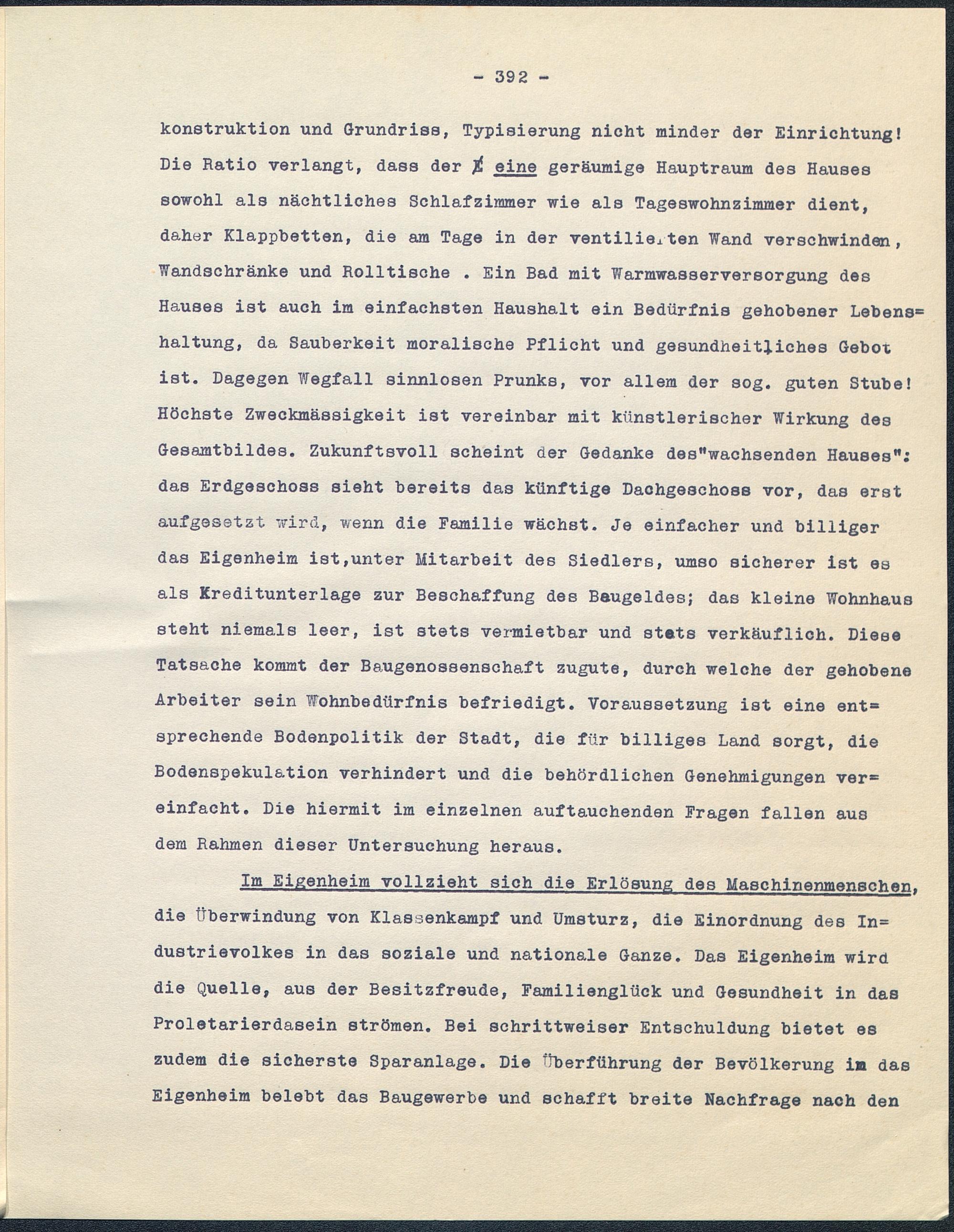 Im Eigenheim vollzieht sich die Erlösung des Maschinenmenschendie Oberwindung von Klassenkampf und Umsturz, die Einordnung des In=dustrievolkes in das soziale und nationale Ganze. Das Eigenheim wirddie Quelle, aus der Besitzfreude, Familienglück und Gesundheit in dasProletarierdasein strömen. Bei schrittweiser Entschuldung bietet eszudem die sicherste Sparanlage. Die Oberführung der Bevölkerung im dasEigenheim belebt das Baugewerbe und schafft breite Nachfrage nach den